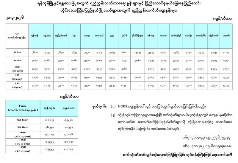 ရန်ကုန်မြို့နှင့် မန္တလေးမြို့အတွက် ရည်ညွှန်းလက်ကားဈေးနှုန်းများနှင့် ပြည်ထောင်စုနယ်မြေ နေပြည်တော်၊ တိုင်းဒေသကြီး/ပြည်နယ် မြို့တော်များအတွက် ရည်ညွှန်းလက်လီဈေးနှုန်းများ