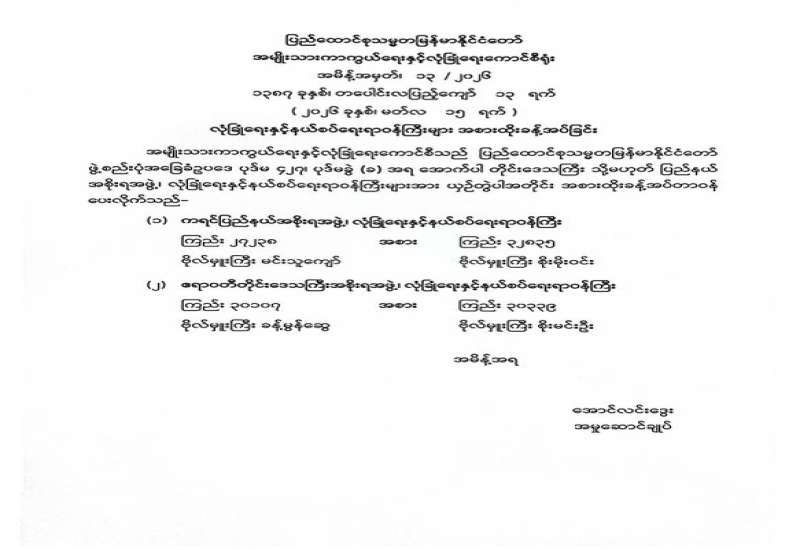 ရန်ကုန်မြို့နှင့် မန္တလေးမြို့အတွက် ရည်ညွှန်းလက်ကားဈေးနှုန်းများနှင့် ပြည်ထောင်စုနယ်မြေ နေပြည်တော်၊ တိုင်းဒေသကြီး/ပြည်နယ် မြို့တော်များအတွက် ရည်ညွှန်းလက်လီဈေးနှုန်းများ