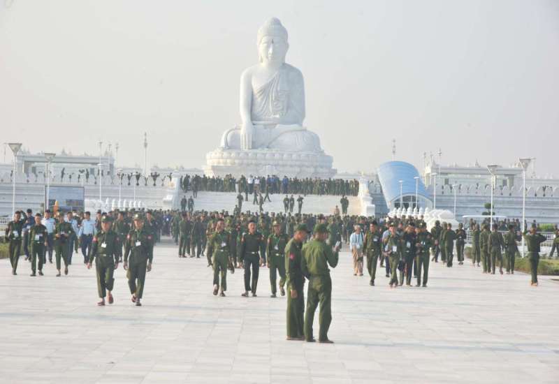 (၈၁) နှစ်မြောက်တပ်မတော်နေ့ စစ်ရေးပြအခမ်းအနားတွင် ပါဝင်ချီတက်ကြမည့် စစ်ရေးပြစစ်ကြောင်းများမှ အရာရှိ၊ စစ်သည်များသည် အဖွဲ့ ၂ ဖွဲ့ခွဲ၍ ယနေ့တွင် ပြည်ထောင်စုနယ်မြေ နေပြည်တော်၊ ဒက္ခိဏသီရိမြို့နယ်ရှိ ဗုဒ္ဓဥယျာဉ်ဝတ္ထုကံတော်တွင် တည်ထားပူဇော်သည့်ကမ္ဘာပေါ်ရှိ ထိုင်တော်မူကျောက်ဆစ်ဗုဒ္ဓရုပ်ပွားတော်များအနက် ဉာဏ်တော်အမြင့်ဆုံးဖြစ်သည့် မာရဝိဇယဗုဒ္ဓရုပ်ပွားတော်မြတ်ကြီးအား လာရောက်ဖူးမြော်ကြည်ညိုကြသည်။
