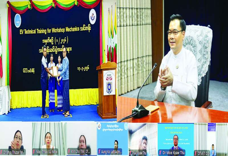 EV Mechanics (၁/၂၀၂၆) သင်တန်းဆင်းပွဲအခမ်းအနားကို ယနေ့မွန်းလွဲပိုင်းတွင် အစိုးရစက်မှုလက်မှုသိပ္ပံ(အင်းစိန်)၌ Hybrid စနစ်ဖြင့်ကျင်းပရာ လျှပ်စစ်သုံးယာဉ်နှင့် ဆက်စပ်ပစ္စည်းများ သုတေသနဖွံ့ဖြိုးရေးနှင့် နည်းပညာပြန့်ပွားရေးလုပ်ငန်းကော်မတီဥက္ကဋ္ဌ သိပ္ပံနှင့်နည်းပညာဝန်ကြီးဌာန ဒုတိယဝန်ကြီး ဒေါက်တာအောင်ဇေယျ၊ နည်းပညာ၊ သက်မွေးပညာနှင့် လေ့ကျင့်ရေးဦးစီးဌာန ညွှန်ကြားရေးမှူးချုပ်၊ ဒုတိယညွှန်ကြားရေးမှူးချုပ်များ၊ တာဝန်ရှိသူများက ဗီဒီယိုကွန်ဖရင့်ဖြင့် တက်ရောက်ကြသည်။