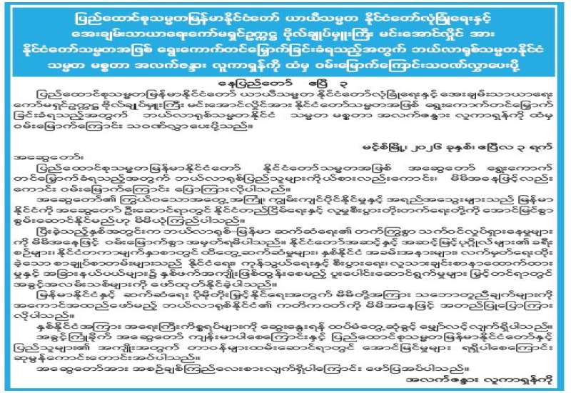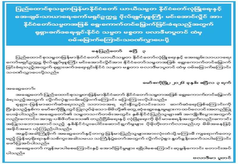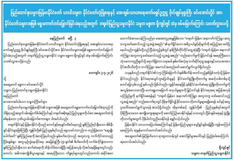 ပြည်ထောင်စုသမ္မတမြန်မာနိုင်ငံတော် ယာယီသမ္မတ နိုင်ငံတော်လုံခြုံရေးနှင့် အေးချမ်းသာယာရေးကော်မရှင်ဥက္ကဋ္ဌ ဗိုလ်ချုပ်မှူးကြီး မင်းအောင်လှိုင် အား နိုင်ငံတော်သမ္မတအဖြစ် ရွေးကောက်တင်မြှောက်ခြင်းခံရသည့်အတွက် တရုတ်ပြည်သူ့သမ္မတနိုင်ငံ သမ္မတ မစ္စတာ ရှီကျင့်ဖျင် ထံမှ ဝမ်းမြောက်ကြောင်း သဝဏ်လွှာပေးပို့