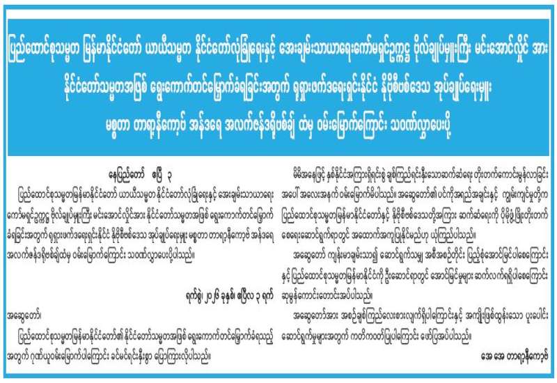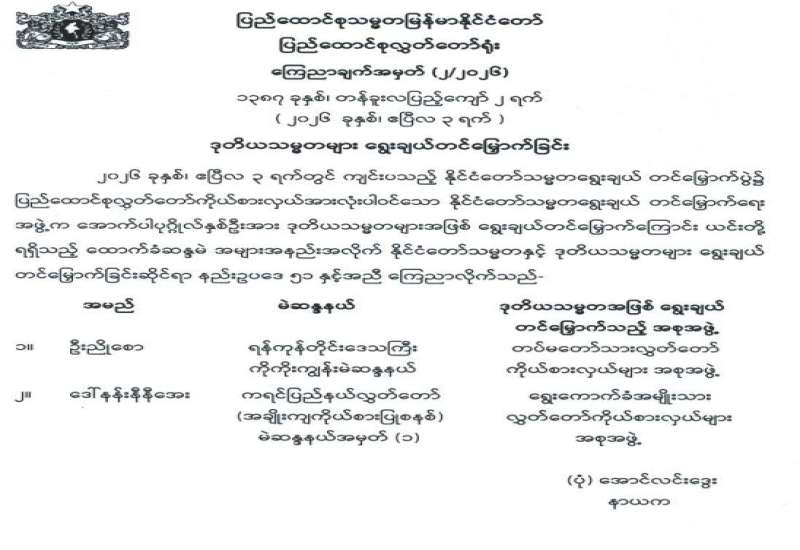ပြည်ထောင်စုသမ္မတ မြန်မာနိုင်ငံတော် ယာယီသမ္မတ နိုင်ငံတော်လုံခြုံရေးနှင့် အေးချမ်းသာယာရေးကော်မရှင်ဥက္ကဋ္ဌ ဗိုလ်ချုပ်မှူးကြီး မင်းအောင်လှိုင် အား နိုင်ငံတော်သမ္မတအဖြစ် ရွေးကောက်တင်မြှောက်ခံရခြင်းအတွက် ရုရှားဖက်ဒရေးရှင်းနိုင်ငံ နိုဗိုစီဗစ်ဒေသ အုပ်ချုပ်ရေးမှူး မစ္စတာ တာရာ့နီကော့ဗ် အန်ဒရေ အလက်ဇန်ဒရိုဗစ်ချ်ထံမှ ဝမ်းမြောက်ကြောင်း သဝဏ်လွှာပေးပို့