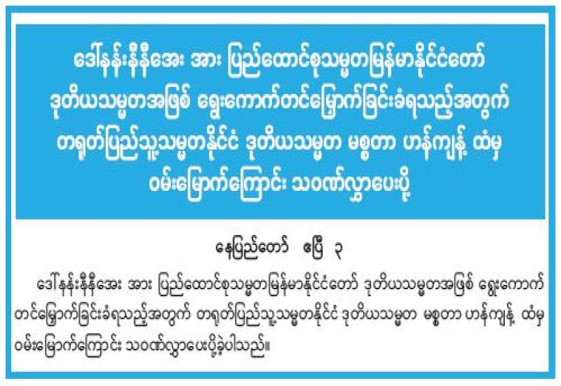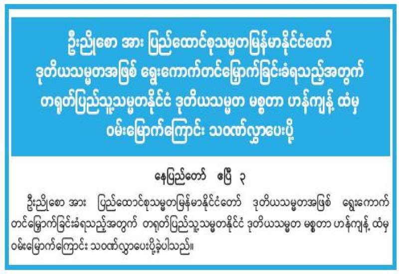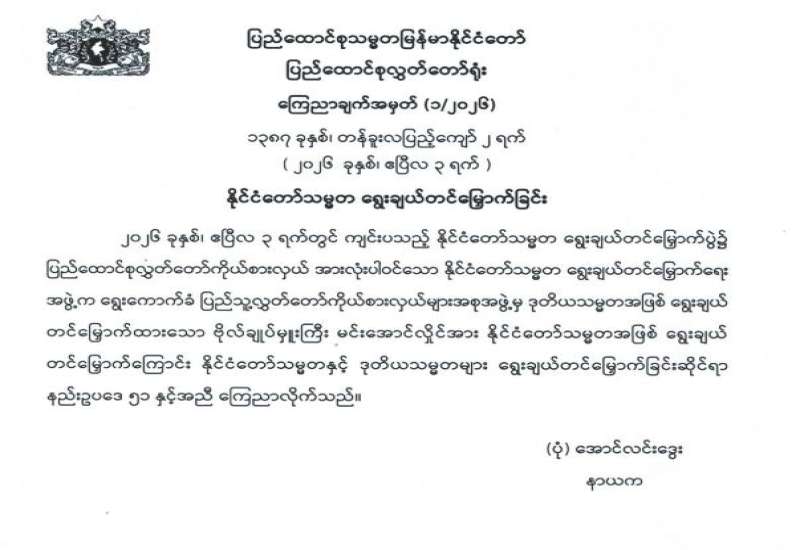 တတိယအကြိမ် ပြည်ထောင်စုလွှတ်တော် နိုင်ငံတော်သမ္မတ ရွေးချယ်တင်မြှောက်ပွဲကို ယနေ့နံနက် ၁၀ နာရီတွင် နေပြည်တော်ရှိ လွှတ်တော်အဆောက်အအုံ ပြည်ထောင်စုလွှတ်တော် အစည်းအဝေးခန်းမ၌ ကျင်းပသည်။