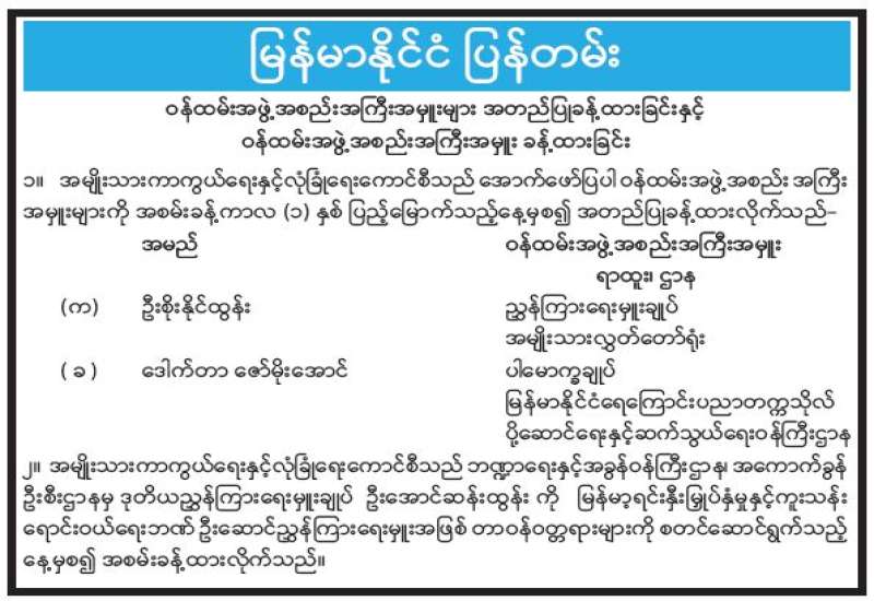 ဝန်ထမ်းအဖွဲ့အစည်းအကြီးအမှူးများ အတည်ပြုခန့်ထားခြင်းနှင့် ဝန်ထမ်းအဖွဲ့အစည်းအကြီးအမှူး ခန့်ထားခြင်း