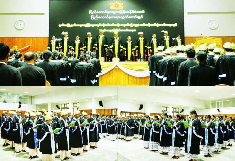 ဒုတိယမြို့နယ် တရားသူကြီးများ လုပ်ငန်းဝင်သင်တန်းအမှတ်စဉ် (၃၄) သင်တန်းဆင်းပွဲနှင့် ကျမ်းသစ္စာပြုပွဲအခမ်းအနားကို ယနေ့နံနက် ၈ နာရီတွင် ပြည်ထောင်စုတရားလွှတ်တော်ချုပ် Judicial College ၌ကျင်းပရာ ပြည်ထောင်စုတရားသူကြီးချုပ် ဦးသာဌေး တက်ရောက်၍ သင်တန်းဆင်း အမှာစကား ပြောကြားသည်။