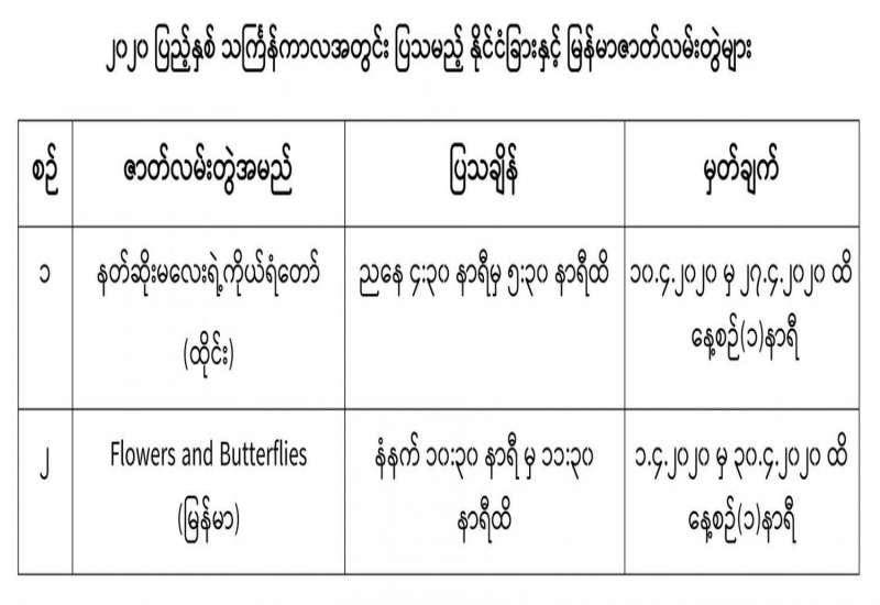 ၂၀၂၀ ပြည့်နှစ်၊ ဧပြီ ၁၀ ရက်မှ ၁၉ ရက်အထိ မြန်မာ့ရိုးရာ မဟာသင်္ကြန်ရုံးပိတ်ရက် ကာလအတွင်း မူလပြသနေသည့် ရုပ်သံဇာတ်လမ်းတွဲများအပြင် မိသားစုနှင့်အတူ အပန်းဖြေအနားယူကြမည့်