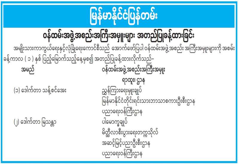 ဝန်ထမ်းအဖွဲ့အစည်းအကြီးအမှူးများ အတည်ပြုခန့်ထားခြင်း