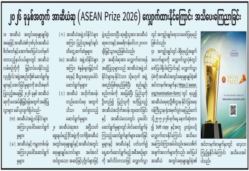 ၂၀၂၆ ခုနှစ်အတွက် အာဆီယံဆု (ASEAN Prize 2026) လျှောက်ထားနိုင်ကြောင်း အသိပေးကြေညာခြင်း