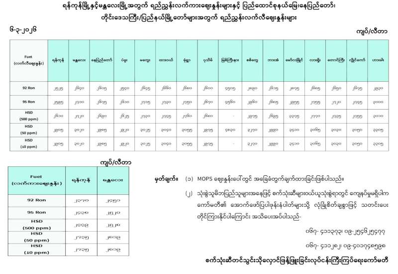 ရန်ကုန်မြို့နှင့် မန္တလေးမြို့အတွက် ရည်ညွှန်းလက်ကားဈေးနှုန်းများနှင့် ပြည်ထောင်စုနယ်မြေ နေပြည်တော်၊ တိုင်းဒေသကြီး/ပြည်နယ် မြို့တော်များအတွက် ရည်ညွှန်းလက်လီဈေးနှုန်းများ