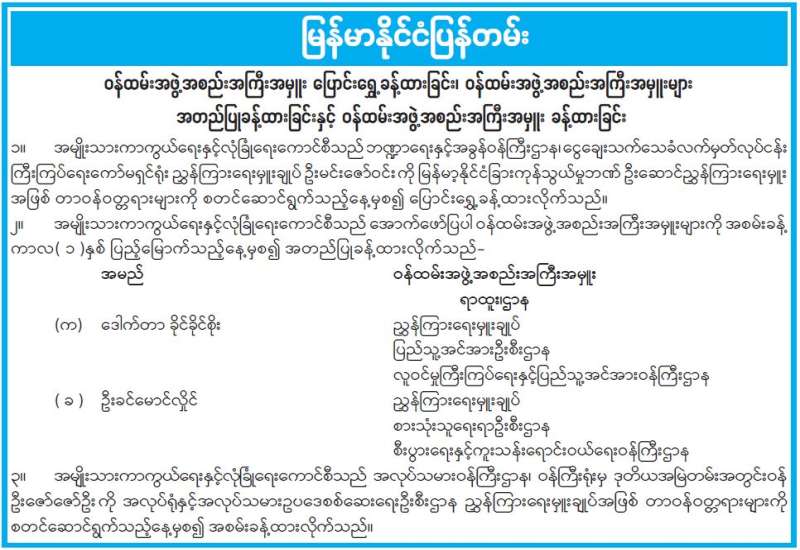 ဝန်ထမ်းအဖွဲ့အစည်းအကြီးအမှူး ပြောင်းရွှေ့ခန့်ထားခြင်း၊ ဝန်ထမ်းအဖွဲ့အစည်းအကြီးအမှူးများ အတည်ပြုခန့်ထားခြင်းနှင့် ဝန်ထမ်းအဖွဲ့အစည်းအကြီးအမှူး ခန့်ထားခြင်း