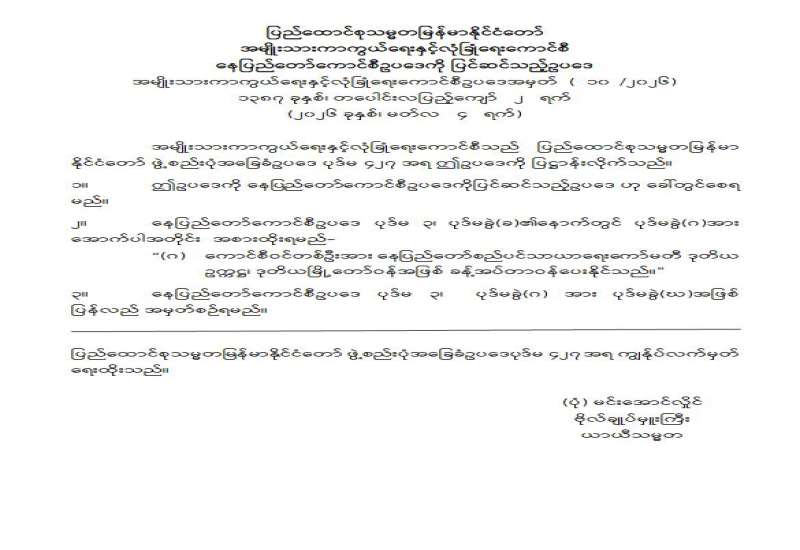 စက်သုံးဆီ ခြိုးခြံချွေတာသုံးစွဲရေးအတွက် ပြည်သူသို့ အသိပေးကြေညာချက်အား ဖြည့်စွက်ထုတ်ပြန်ခြင်း