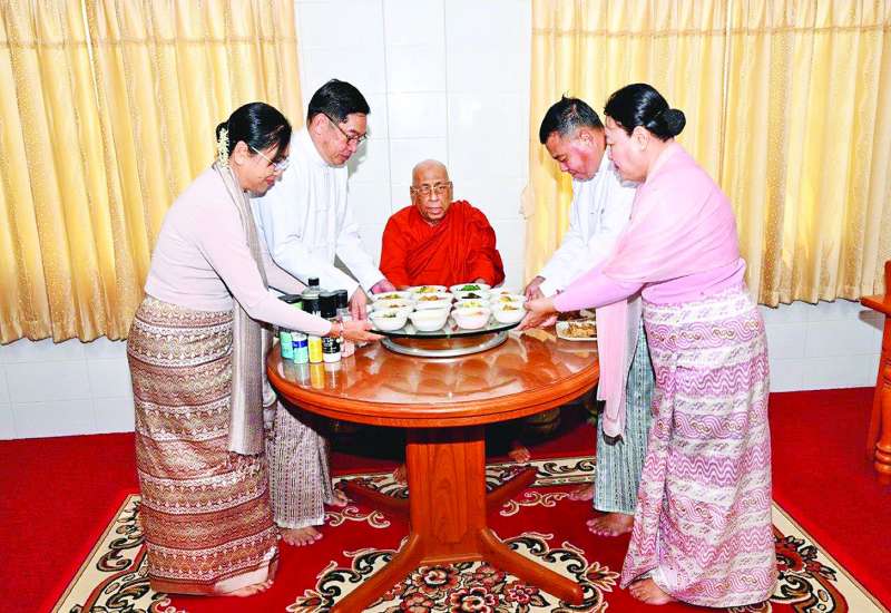၂၀၂၆ ခုနှစ်၊ သာသနာတော်ဆိုင်ရာ ဘွဲ့တံဆိပ်တော် ဆက်ကပ်ခံယူတော်မူမည့် ဆရာတော်ကြီးများအား နေ့ဆွမ်းဆက်ကပ်လှူဒါန်းခြင်းကို ယနေ့နံနက်ပိုင်းတွင် နေပြည်တော်၊ မာရဝိဇယဗုဒ္ဓဥယျာဉ်တော်ပရိဝုဏ်အတွင်းရှိ အဂ္ဂါဓိပတိသာသနာ့ဗိမာန်တော်ကြီး၌ ကျင်းပရာ ပြည်ထောင်စုသမ္မတမြန်မာနိုင်ငံတော်ယာယီသမ္မတ နိုင်ငံတော်လုံခြုံရေးနှင့်အေးချမ်းသာယာရေးကော်မရှင်ဥက္ကဋ္ဌ ဗိုလ်ချုပ်မှူးကြီး မင်းအောင်လှိုင်နှင့် ဇနီး ဒေါ်ကြူကြူလှတို့ တက်ရောက်၍ နေ့ဆွမ်းဆက်ကပ်လှူဒါန်းသည်။