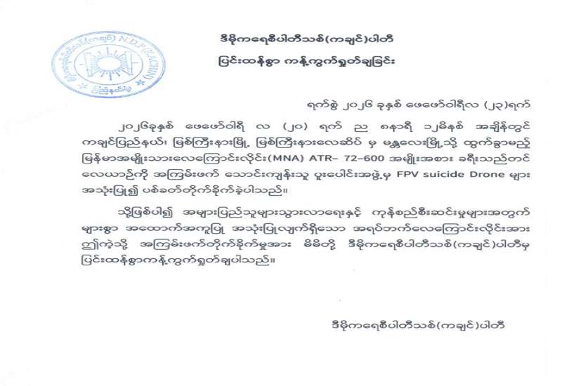 ကချင်ပြည်နယ်၏ အဓိကလေကြောင်းဗဟိုချက်တစ်ခုဖြစ်သော အများပြည်သူသွားလာရေးနှင့် ကုန်စည်စီးဆင်းမှုမြန်ဆန်စေရေးအတွက် များစွာအထောက်အကူပြုလျက်ရှိသည့် မြစ်ကြီးနားလေဆိပ်အား KIA အဖွဲ့နှင့် PDF အမည်ခံ အကြမ်းဖက်သောင်းကျန်းသူပူးပေါင်းအဖွဲ့များက ဖေဖော်ဝါရီ ၂၀ ရက် ည ၈ နာရီ ၁၂ မိနစ်ခန့်တွင် FPV Suicide Drone များအသုံးပြု၍ ခရီးသွားပြည်သူများ သေဆုံး၊ ထိခိုက်ဒဏ်ရာရရှိစေရန် ယုတ်မာပက်စက်သော ရည်ရွယ်ချက်ဖြင့် ပစ်ခတ်တိုက်ခိုက်ခဲ့မှုအပေါ် ဒေသခံပြည်သူများအပြင် တစ်နိုင်ငံလုံးရှိ ပြည်သူလူထုတစ်ရပ်လုံးကပါ လုံးဝလက်ခံနိုင်ခြင်းမရှိဘဲ အဖွဲ့အစည်းအသီးသီးမှလည်း ကန့်ကွက်ရှုတ်ချလျက်ရှိကြပြီး ပြည်ထောင်စုသမ္မတမြန်မာနိုင်ငံတော် ကချင်ပြည်နယ်အထူးဒေသ(၁)၊ ထာဝရငြိမ်းချမ်းရေးအဖွဲ့ချုပ် ဦးဆောင်ကော်မတီနှင့် ဒီမိုကရေစီပါတီသစ်(ကချင်)ပါတီတို့ကလည်း ပြင်းထန်စွာကန့်ကွက်ရှုတ်ချပါကြောင်း အောက်ပါအတိုင်း သဘောထားများ အသီးသီးထုတ်ပြန်ခဲ့ကြကြောင်း သိရှိရသည်။