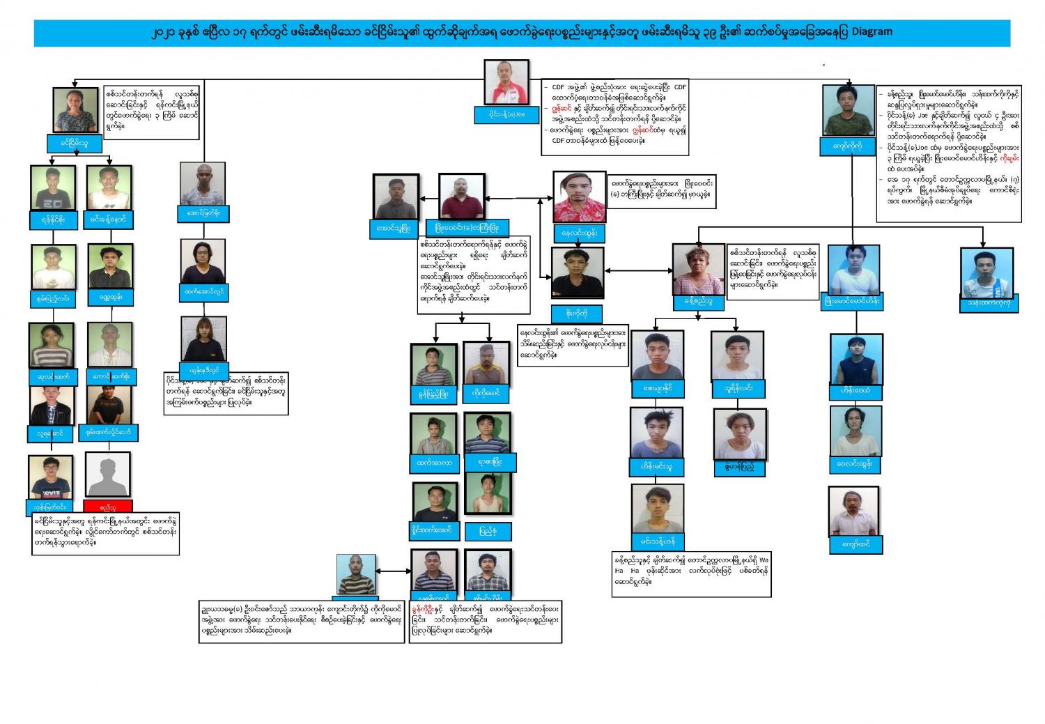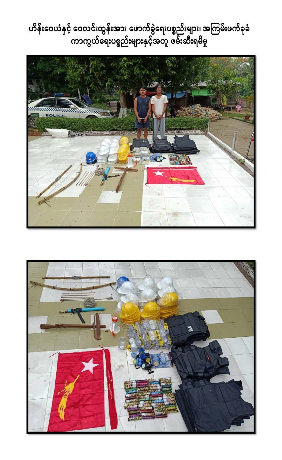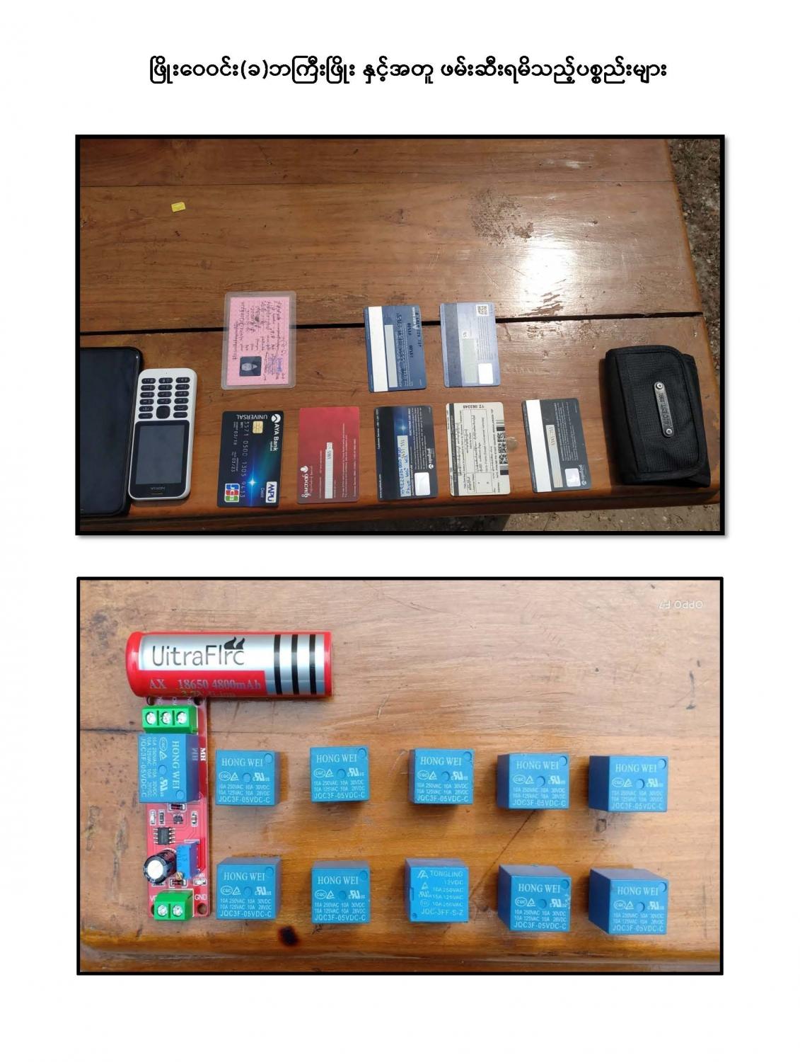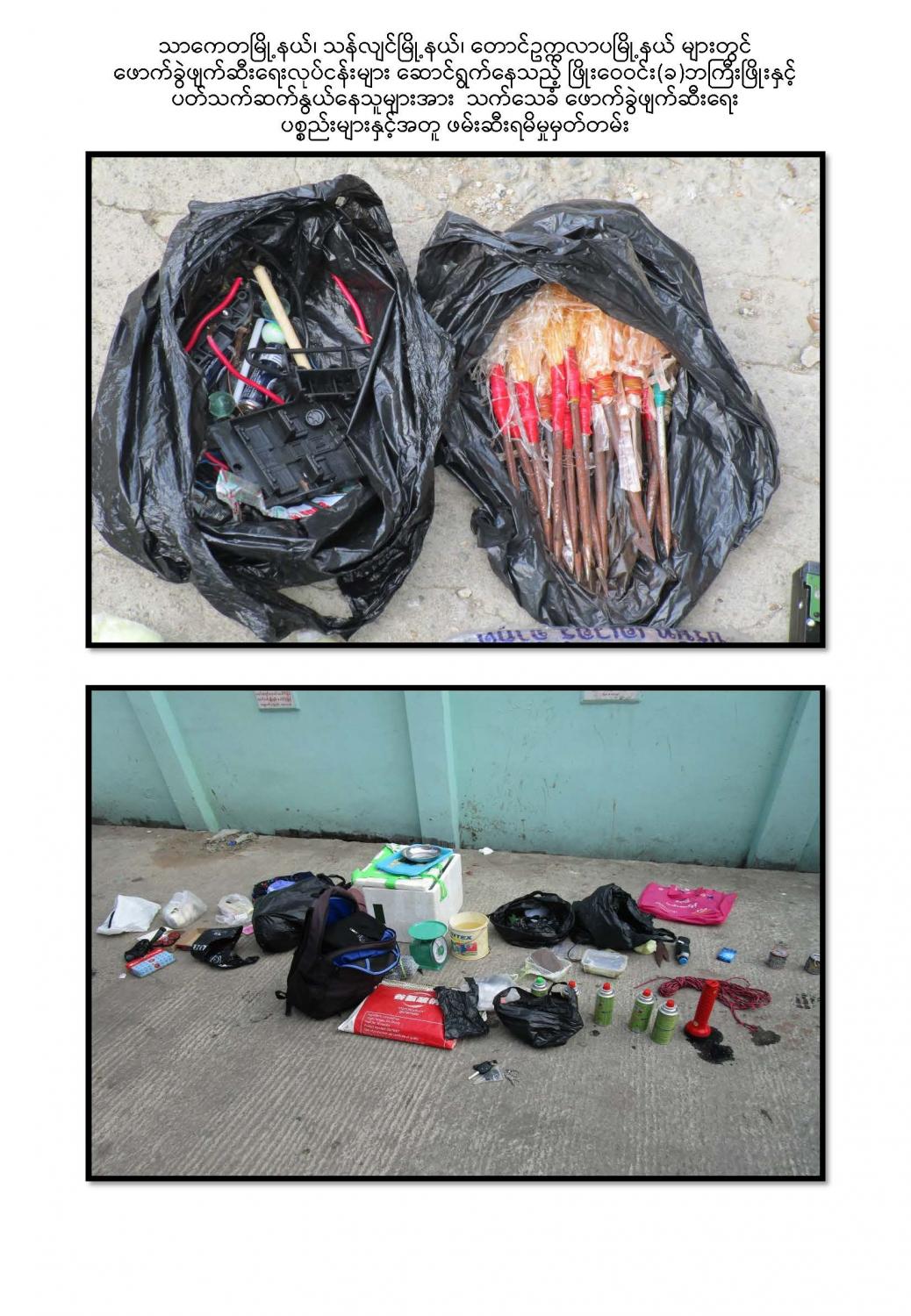 ဆက်လက်ထွက်ဆိုချက်အရ ဧပြီ ၁၈ ရက်တွင် ကယားပြည်နယ် အတွင်းရှိ တိုင်းရင်းသားလက်နက်ကိုင်အဖွဲ့အစည်းတစ်ခုထံသို့ စစ်သင်တန်း တက်ရောက်ရန် စီစဉ်နေသူ ကောင်းဆက်စိုး၊ ၂၀ နှစ်၊ (ဘ)ဦးဆန်းလွင်ကို ရန်ကင်းမြို့နယ်ရှိ ၎င်း၏ နေအိမ်တွင်လည်းကောင်း၊ ပိုင်သန့်(ခ)Joe ၊ ၃၂ နှစ်၊ (ဘ) ဦးဆန်းမြိုင်ကို မရမ်းကုန်း မြို့နယ်၊ အမှတ်(၆)ရပ်ကွက်၊ ရွှေရတနာလမ်း၊ အမှတ်(၁၈/A-1/D)ရှိ ၎င်း၏နေအိမ်တွင် ယမ်းမှုန့်အဖြူရောင် ၂ ပိဿာခန့်၊ ယမ်းမှုန့် အဝါရောင် ၅၀ ကျပ်သားခန့်၊ ယမ်းကြိုးခွေ ပေ ၃၀ ခန့်၊ ဆန့်ကျင်ရေးစာသားပါ ဗွီနိုင်းမျိုးစုံ ၇၃ ခု၊ ကွန်ပျူတာ၊ ဆက်စပ်ပစ္စည်း များနှင့် အခြားအသုံးအဆောင် ပစ္စည်းများအပါအဝင် အကြမ်းဖက်ရာတွင် အသုံးပြု သည့်ပစ္စည်းများနှင့်အတူ ဖမ်းဆီးရမိခဲ့သည်။