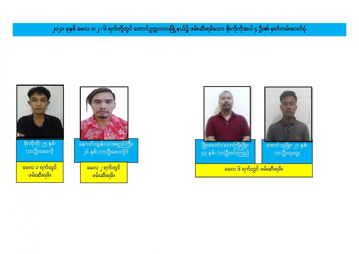 ထို့ပြင် မေ ၁ ရက်တွင် စိုးကိုကို၊ ၂၅ နှစ်၊ (ဘ)ဦးအေးကို အား သင်္ဃန်းကျွန်းမြို့နယ်၊ လေးထောင့်ကန်လမ်းမကြီးပေါ်၌ လည်းကောင်း၊ မေ ၂ ရက်တွင် နေလင်းထွန်း(ခ)အရှည်ကြီး၊ ၂၆ နှစ်၊ (ဘ)ဦးစောလှိုင် ကို တောင်ဥက္ကလာပ မြို့နယ်၊ နန္နဝန်ဈေးအနီး၌လည်းကောင်း၊ မေ ၆ ရက်တွင် ဖြိုးဝေဝင်း(ခ)ဘကြီးဖြိုး၊ ၄၃ နှစ်၊ (ဘ)ဦးဝင်းကြည်နှင့် အောင်သူဖြိုး၊ ၂၇ နှစ်၊ (ဘ)ဦးလှဌေးတို့ ၂ ဦးကို တောင်ဥက္ကလာပ မြို့နယ်၊ သုမင်္ဂလာလမ်းနှင့် အင်းဝလမ်းထောင့်ရှိ ပြည့်ချမ်းခေတ် လက်ဖက်ရည်ဆိုင်၌ လည်းကောင်း ဖမ်းဆီးရမိခဲ့သည်။