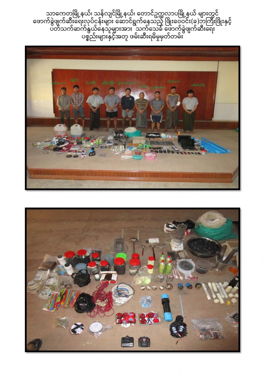 ဖမ်းဆီးထိန်းသိမ်းထားသူများ၏ ထွက်ဆိုချက်အရ မေ ၈ ရက်တွင် သာကေတ မြို့နယ်အတွင်းနေထိုင်သူ ခွန်ပြည့်ဖြိုး၊ ၂၆ နှစ်၊ (ဘ)ဦးဉာဏ်ထွန်း၊ ပြည့်စုံ၊ ၂၆ နှစ်၊ (ဘ)ဦးမောင်ဝင်း၊ ထက်အာကာ၊ ၂၂ နှစ်၊ (ဘ)ဦးခင်မောင်၊ ရာဇာဖြိုး၊ ၁၈ နှစ်၊ (ဘ)ဦးခင်ရွှေ၊ ရှိုင်းထက်အောင်၊ ၁၈ နှစ်၊ (ဘ)ဦးဇော်ဝင်း၊ ကိုကိုမောင်၊ ၃၄ နှစ်၊ (ဘ)ဦးစိုးသန့်၊ စစ်မင်းဟိန်း၊ ၂၃ နှစ်၊ (ဘ)ဦးစိုးလွင်နှင့် နန္ဒစစ်အောင်၊ ၂၁ နှစ်၊ (ဘ)ဦးဇေယျာလွင်တို့ကို ဖမ်းဆီးရမိခဲ့ပြီး ၎င်းတို့ ၈ ဦး၏ ထွက်ဆိုချက်အရ မေ ၉ ရက် တွင် သာကေတမြို့နယ်၊ ရှုခင်းသာလမ်းမကြီးရှိ Standard Lab ဓာတ်ခွဲခန်းကို စစ်ဆေးရှာဖွေရာ ဆိုဒီယမ်ကလိုရိုက် ၂ ဘူး၊ ယမ်းမဲ ၄ ဘူး၊ မက္ကနီဆီယမ် ၂ ဘူး၊ ပိုတက်ဆီယမ်နိုက်ထရိတ် ၁ အိတ်နှင့် ဆက်စပ်ပစ္စည်းများကို ဖမ်းဆီးထိန်းသိမ်းနိုင် ခဲ့သည်။