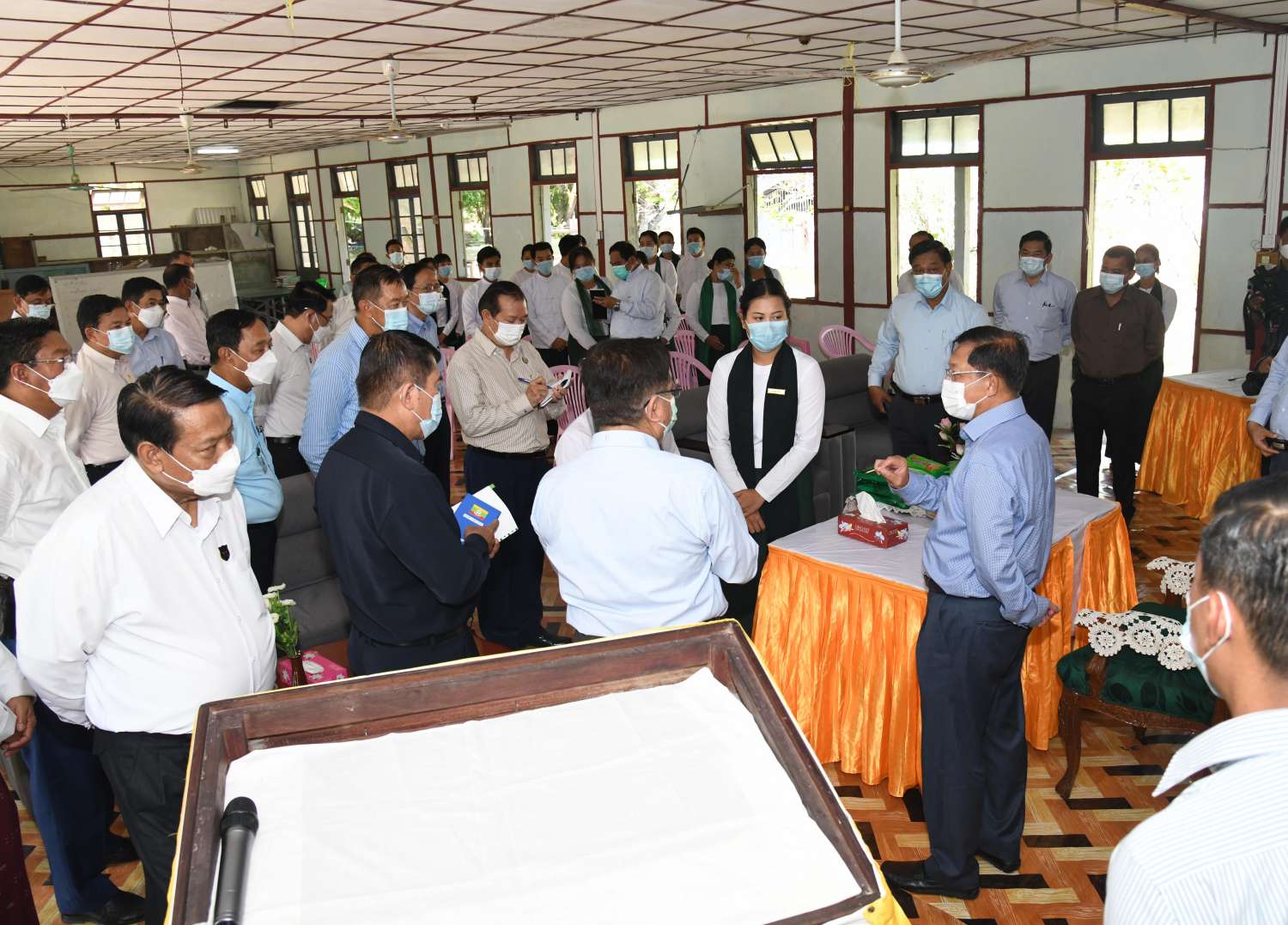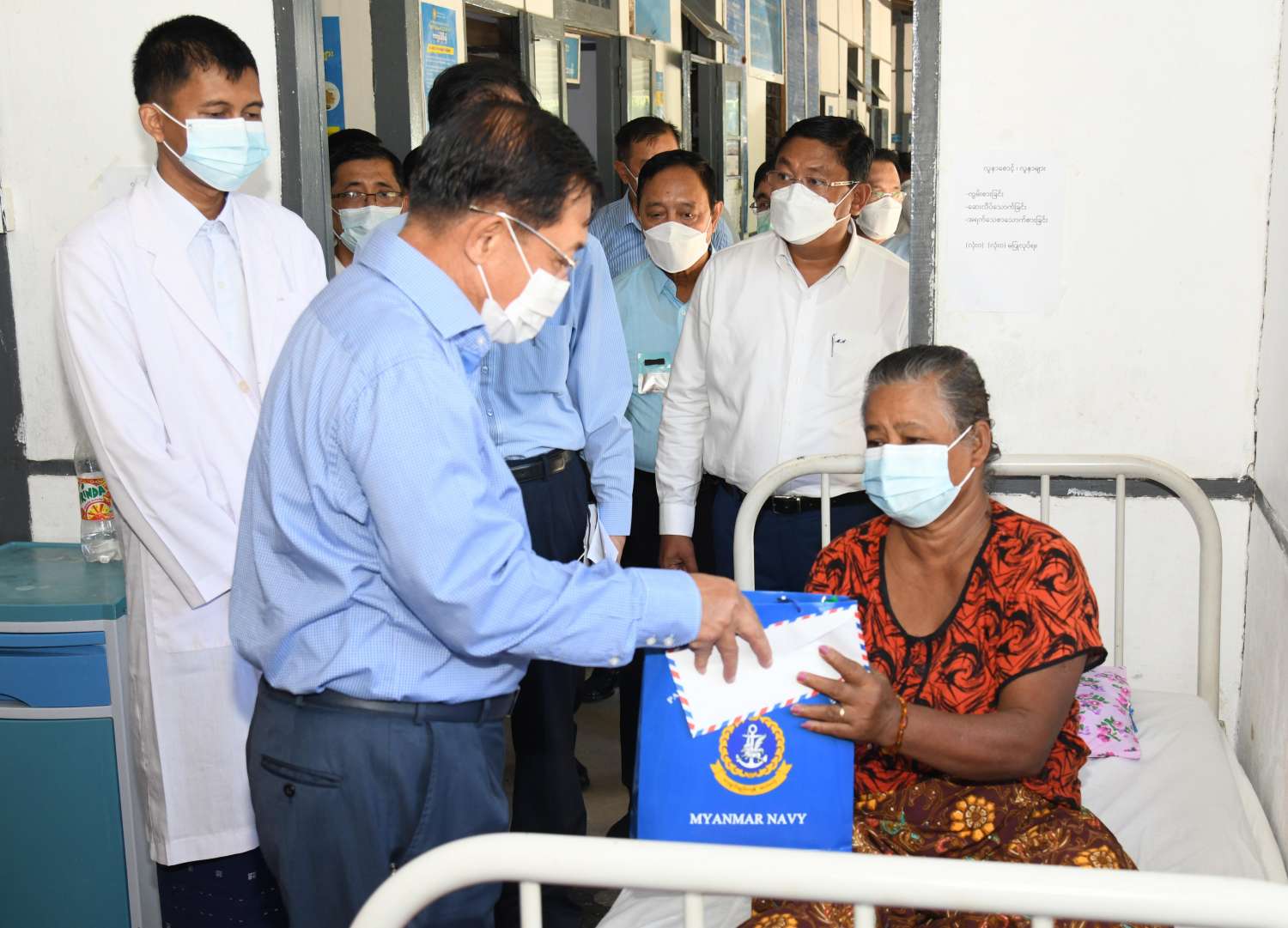 ထို့နောက် နိုင်ငံတော်စီမံအုပ်ချုပ်ရေးကောင်စီဥက္ကဋ္ဌ၊ နိုင်ငံတော် ဝန်ကြီးချုပ်က ဆေးရုံအတွက် စားသောက်ဖွယ်ရာပစ္စည်းများကို ထောက်ပံ့ပေးအပ်ရာ ဆေးရုံအုပ်ကြီးက လက်ခံရယူသည်။ ယင်းနောက် နိုင်ငံတော်စီမံအုပ်ချုပ်ရေးကောင်စီဥက္ကဋ္ဌ၊ နိုင်ငံ တော် ဝန်ကြီးချုပ်နှင့် အဖွဲ့ဝင်များသည် ဆေးရုံအတွင်း လှည့်လည်ကြည့်ရှု၍ ဆေးရုံ တက်ရောက်ကုသမှု ခံယူနေသူများအား ရင်းရင်းနှီးနှီးအားပေးစကားပြောကြားကာ စားသောက်ဖွယ်ရာပစ္စည်းများ ပေးအပ်သည်။