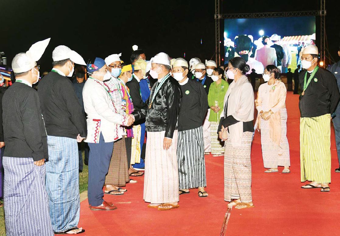 ယင်းနောက် နိုင်ငံတော်စီမံအုပ်ချုပ်ရေးကောင်စီဥက္ကဋ္ဌ နိုင်ငံတော်ဝန်ကြီးချုပ် ဗိုလ်ချုပ်မှူးကြီး မင်းအောင်လှိုင်နှင့် ဇနီးဒေါ်ကြူကြူလှတို့သည် ညစာစားပွဲအခမ်းအနား ကျင်းပရာနေရာသို့ ရောက် ရှိကြရာ နိုင်ငံတော်စီမံအုပ်ချုပ်ရေးကောင်စီ ဒုတိယဥက္ကဋ္ဌ၊ ဒုတိယဝန်ကြီးချုပ် ဒုတိယ ဗိုလ်ချုပ်မှူးကြီး စိုးဝင်းနှင့်ဇနီး ဒေါ်သန်းသန်းနွယ်၊ ပြည်ထောင်စုဝန်ကြီးများနှင့်ဇနီးများက ကြိုဆိုနှုတ်ဆက်ကြပြီး ၎င်းတို့နှင့်အတူ ဥပစာမြက်ခင်းပြင်သို့ရောက်ရှိပြီး နိုင်ငံရေးပါတီများမှ ဥက္ကဋ္ဌများနှင့် ကိုယ်စားလှယ်များ အား ရင်းရင်းနှီးနှီးလိုက်လံနှုတ်ဆက်သည်။