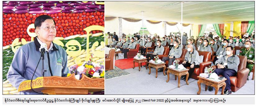 စိုက်ပျိုးရေး၊ မွေးမြူရေးနှင့် ဆည်မြောင်းဝန်ကြီးဌာန၊ စိုက်ပျိုးရေးဦးစီးဌာက ကျင်းပပြုလုပ်သည့် မျိုးစေ့ပြပွဲ ၂၀၂၂ (Seed Fair 2022) ဖွင့်ပွဲအခမ်းအနားကို ယနေ့နံနက်ပိုင်းတွင် နေပြည်တော်ကောင်စီနယ်မြေ ပျဉ်းမနားမြို့ စိုက်ပျိုးရေးသိပ္ပံကျောင်း၌ကျင်းပရာ နိုင်ငံတော်စီမံအုပ်ချုပ်ရေး ကောင်စီဥက္ကဋ္ဌ နိုင်ငံတော်ဝန်ကြီးချူပ် ဗိုလ်ချုပ်မှူးကြီး မင်းအောင်လှိုင် တက်ရောက်ဖွင့်လှစ်ပြီး အမှာစကားပြောကြားသည်။