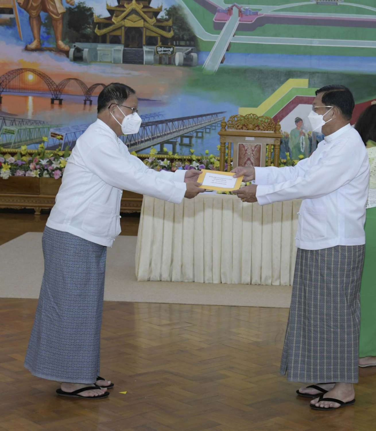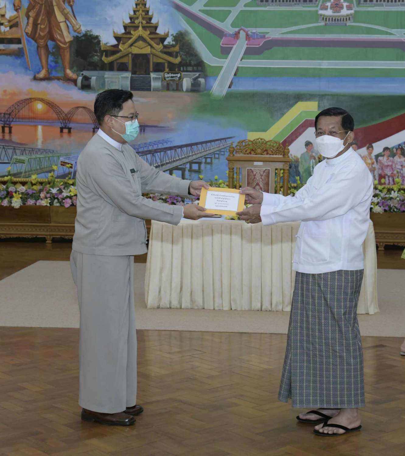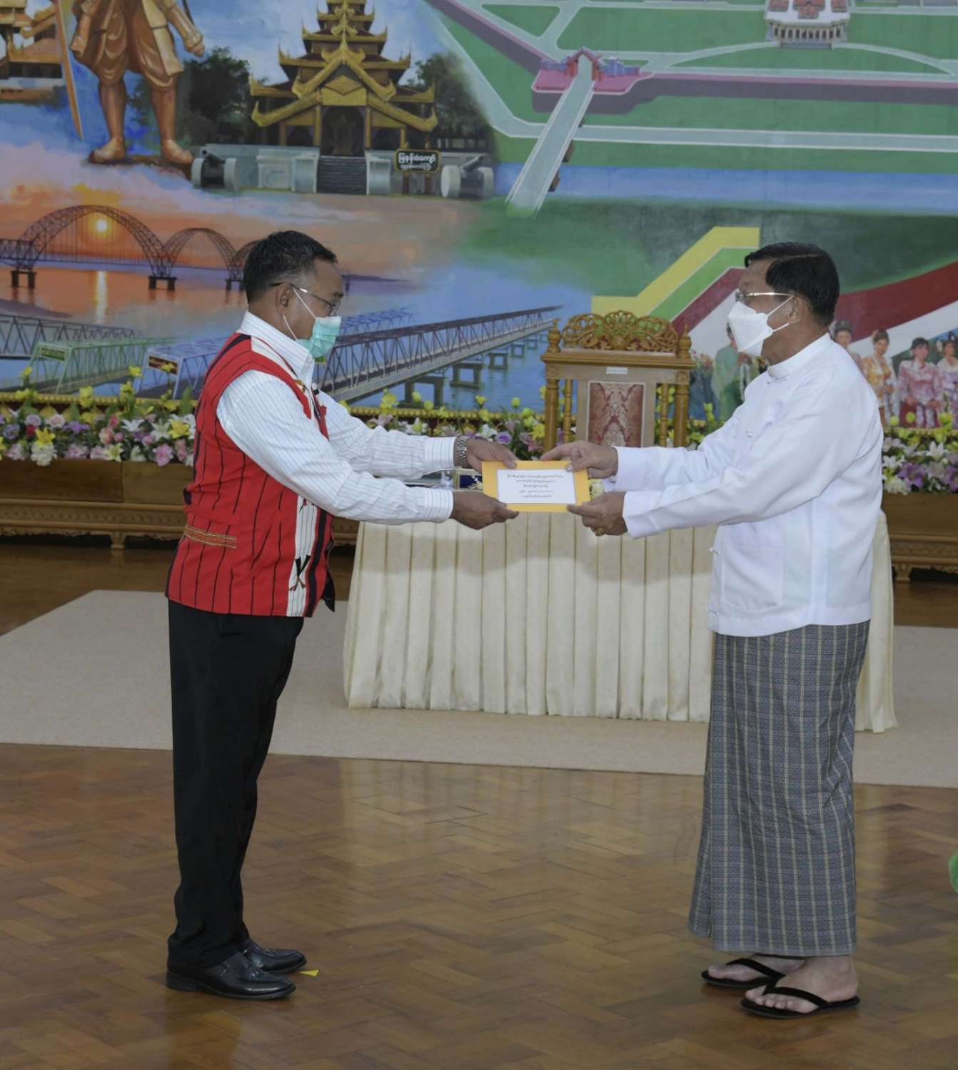 ထို့နောက် နိုင်ငံတော်စီမံအုပ်ချုပ်ရေးကောင်စီဥက္ကဋ္ဌ နိုင်ငံတော်ဝန်ကြီးချုပ်က နိုင်ငံ့စီးပွား မြှင့်တင်ရေး ရန်ပုံငွေမှ ထောက်ပံ့ငွေကို ပေးအပ်ရာ စိုက်ပျိုးရေး၊ မွေးမြူရေးနှင့် ဆည်မြောင်း ဝန်ကြီးဌာန ပြည်ထောင်စုဦးတင်ထွဋ်ဦး၊ သမဝါယမနှင့် ကျေးလက်ဖွံ့ဖြိုးရေးဝန်ကြီးဌာန ပြည်ထောင်စုဝန်ကြီး ဦးလှမိုး၊ ကချင်ပြည်နယ်၊ ကယား ပြည်နယ်၊ ကရင်ပြည်နယ်၊ ချင်းပြည်နယ်၊ တနင်္သာရီတိုင်းဒေသကြီး၊ မွန်ပြည်နယ်၊ ရခိုင်ပြည်နယ်၊ ရှမ်းပြည်နယ် အစိုးရအဖွဲ့တို့မှ ဝန်ကြီးချုပ်များ၊ နာဂ၊ ဓနု၊ ပအိုဝ့်၊ ပလောင်၊ ကိုးကန့် ကိုယ်ပိုင် အုပ်ချုပ်ခွင့်ရဒေသတို့နှင့် “ဝ” ကိုယ်ပိုင်အုပ်ချုပ်ခွင့်ရတိုင်း စီမံအုပ်ချုပ်ရေး အဖွဲ့တို့မှ ဥက္ကဋ္ဌများက အသီးသီး လက်ခံရယူကြသည်။