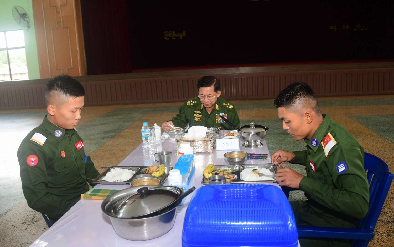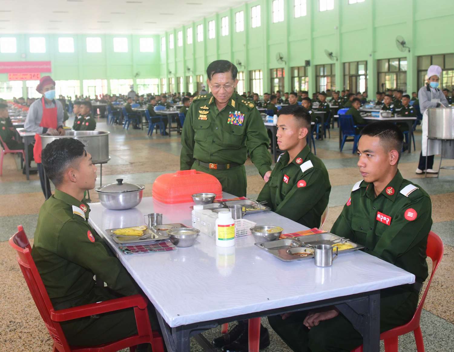 ထို့နောက် နေ့လယ်ပိုင်းတွင် နိုင်ငံတော်စီမံအုပ်ချုပ်ရေးကောင်စီဥက္ကဋ္ဌ တပ်မတော်ကာကွယ်ရေးဦးစီးချုပ်နှင့် အဖွဲ့ဝင်များသည် ပညာတန်ဆောင် ဗိုလ်လောင်းစားရိပ်သာ၌ သင်တန်းသားဗိုလ်လောင်းများနှင့်အတူ နေ့လယ်စာကို အတူတကွသုံးဆောင်ခဲ့ကြပြီး ဗိုလ်လောင်းများအား ရင်းရင်းနှီးနှီး လိုက်လံနှုတ်ဆက်၍ အားပေးစကားပြောကြားခဲ့သည်။ ယင်းနောက် မွန်းလွဲပိုင်းတွင် စစ်လက်ရုံးရွေးချယ်မှုအား ဆက်လက်ပြုလုပ်ခဲ့ကြောင်း သတင်းရရှိသည်။