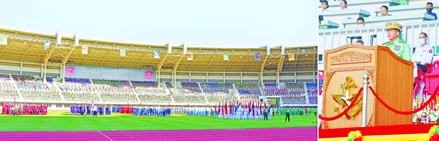 ယနေ့ကျင်းပသည့် တပ်မတော် (ကြည်း၊ ရေ၊ လေ) အားကစားပြိုင်ပွဲသည် နိုင်ငံတော် ကချမှတ်ထားသည့် “တစ်မျိုးသားလုံးကျန်းမာ ကြံ့ခိုင်ရေးနှင့် ပညာရည်မြင့်မားရေး” ဟူသည့် လူမှုရေးဦးတည်ချက်ပါ ပြဋ္ဌာန်းချက်ကို တပ်မတော်အနေဖြင့် အကောင်အထည်ဖော် ဆောင်ရွက်ခြင်းလည်းဖြစ်ကြောင်း၊ နိုင်ငံတော်နှင့် တပ်မတော်အပိုင်းရှိ တာဝန်ရှိသူများက လိုအပ်သည့်ဖြည့်ဆည်းမှုများကို စီမံဆောင်ရွက်ပေးသွားမည်ဖြစ်သကဲ့သို့ တပ်မတော်သား အားကစားသမားများအနေဖြင့်လည်း နိုင်ငံတော်နှင့်တပ်မတော်အတွက် အားကစားသမားကောင်းစိတ်ဓာတ်အပြင် အဖွဲ့အစည်းအချင်းချင်း စည်းလုံးညီညွတ်စွာ ပေါင်းစည်းဆောင်ရွက်တတ်ခြင်း စိတ်ဓာတ်များကို မွေးမြူသွားရမည်ဖြစ်ကြောင်းဖြင့် နိုင်ငံတော်စီမံအုပ်ချုပ်ရေးကောင်စီဥက္ကဋ္ဌ တပ်မတော်ကာကွယ်ရေးဦးစီးချုပ် ဗိုလ်ချုပ်မှူးကြီး မင်းအောင်လှိုင်က ယနေ့ညနေပိုင်းတွင် နေပြည်တော်ရှိ ဇေယျာသီရိတပ်မတော်အားကစားကွင်း၌ ကျင်းပပြုလုပ်သည့် ၂၀၂၂ ခုနှစ်၊ တပ်မတော် (ကြည်း၊ ရေ၊ လေ) အားကစားပြိုင်ပွဲဖွင့်ပွဲ အခမ်းအနား၌ အဖွင့်မိန့်ခွန်းပြောကြားရာတွင် ထည့်သွင်းပြောကြားသည်။