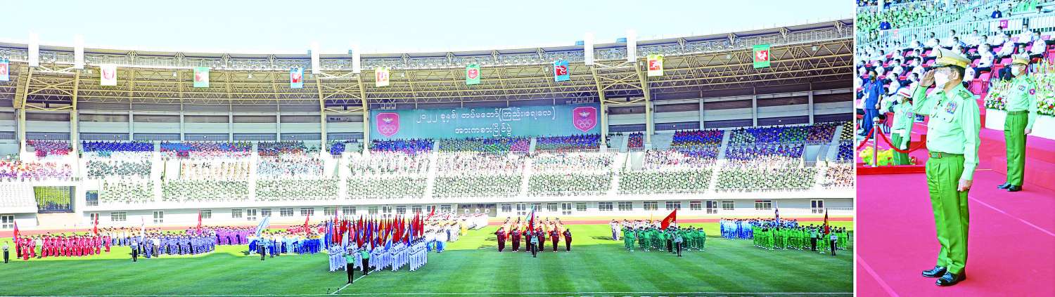 ထို့နောက် နိုင်ငံတော်စီမံအုပ်ချုပ်ရေးကောင်စီဥက္ကဋ္ဌ တပ်မတော်ကာကွယ်ရေး ဦးစီးချုပ်သည် စစ်ရေးပြမှူးကြီး ဦးဆောင်သောအလံတော်အဖွဲ့နှင့် အားကစားသမားများ၏ အလေးပြုခြင်းကိုခံယူသည်။