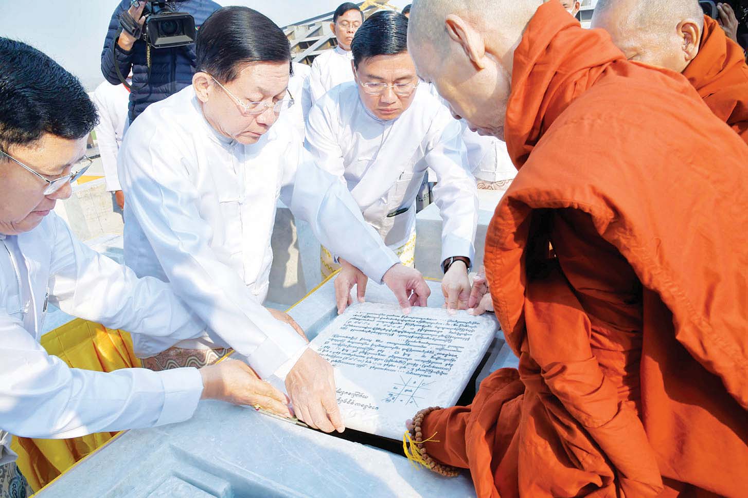 ယင်းနောက် ဦးဆောင်ဘုရားဒါယကာ နိုင်ငံတော်စီမံအုပ်ချုပ်ရေးကောင်စီဥက္ကဋ္ဌ နိုင်ငံတော်ဝန်ကြီးချုပ်နှင့် ဘုရားဒါယကာများက ဆရာတော်ကြီးများ ရွတ်ပွား သရဇ္စျာယ်တော်မူကြသည့် ဇယမင်္ဂလာဂါထာတော်ကို နာယူကြည်ညိုကြသည်။