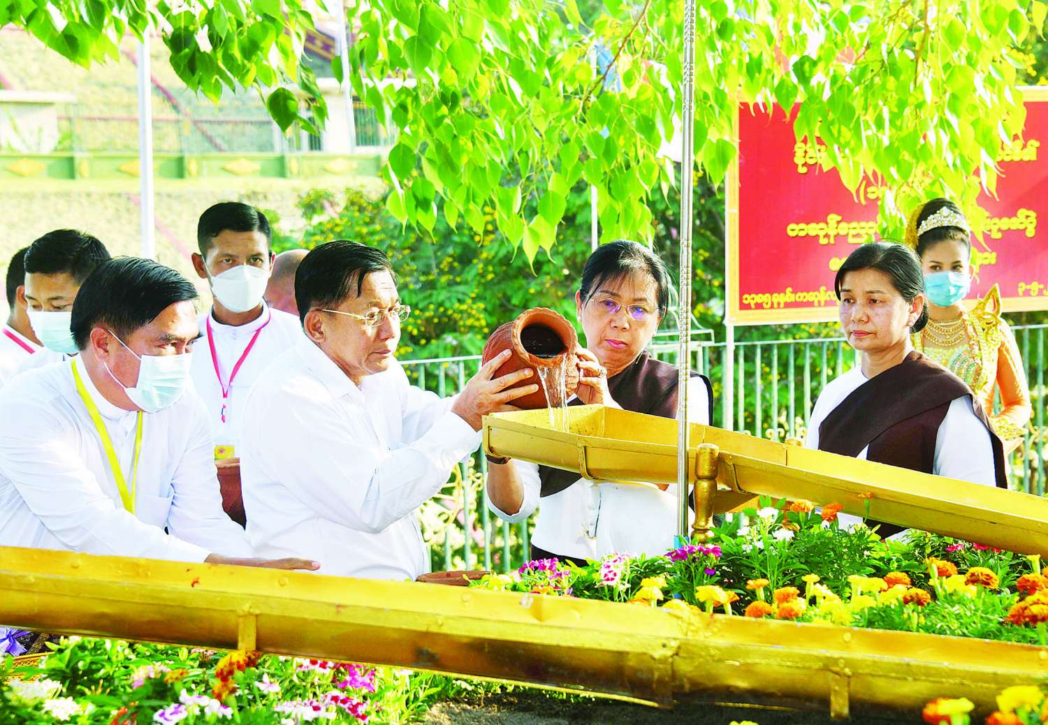 ဗုဒ္ဓဘာသာမြန်မာလူမျိုးတို့၏ ၁၂ လရာသီပွဲတော်တွင် တစ်ခုအပါအဝင်ဖြစ်သည့် မြန်မာသက္ကရာဇ် ၁၃၈၅ ခုနှစ်၊ ကဆုန်လပြည့်ဗုဒ္ဓနေ့ဖြစ်သော ယနေ့တွင်ကျရောက်သည့် ကဆုန်ညောင်ရေသွန်းပွဲတော်တွင် နေပြည်တော်၊ ဥပ္ပါတသန္တိစေတီတော်မြတ်ကြီး ပရိဝုဏ်တော် မြောက်ဘက်အရပ်ရှိ မဟာဗောဓိညောင်ပင်တော်များအား (၁၅)ကြိမ်မြောက် ကဆုန် ညောင်ရေသွန်းလောင်းပူဇော်ခြင်း မင်္ဂလာအခမ်းအနားကို ယနေ့ညနေပိုင်း၌ ကျင်းပပြုလုပ်ရာ နိုင်ငံတော်စီမံအုပ်ချုပ်ရေးကောင်စီဥက္ကဋ္ဌ နိုင်ငံတော်ဝန်ကြီးချုပ် ဗိုလ်ချုပ်မှူးကြီး မင်းအောင်လှိုင်နှင့် ဇနီးဒေါ်ကြူကြူလှတို့က မဟာဗောဓိညောင်ပင်တော်များကို ညောင်ရေသွန်းလောင်း ပူဇော်ကြသည်။