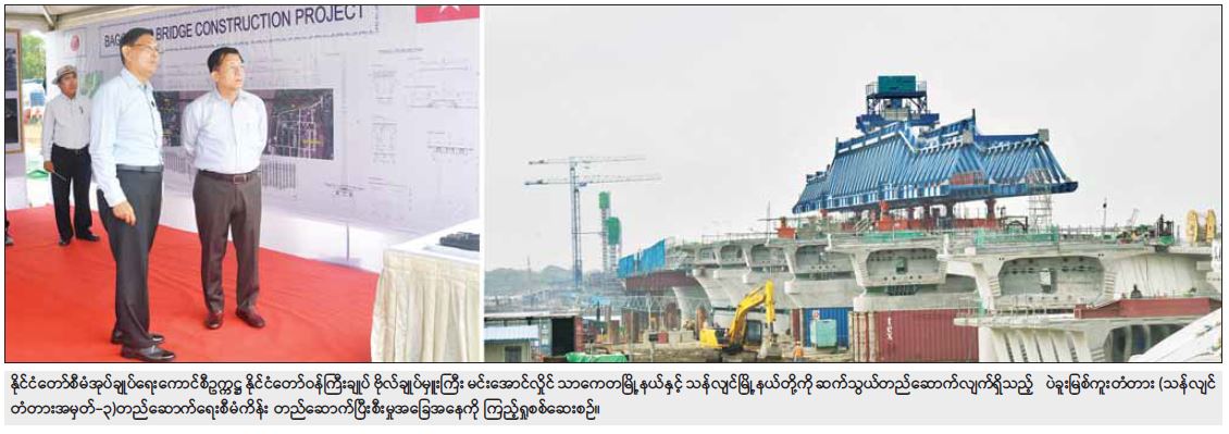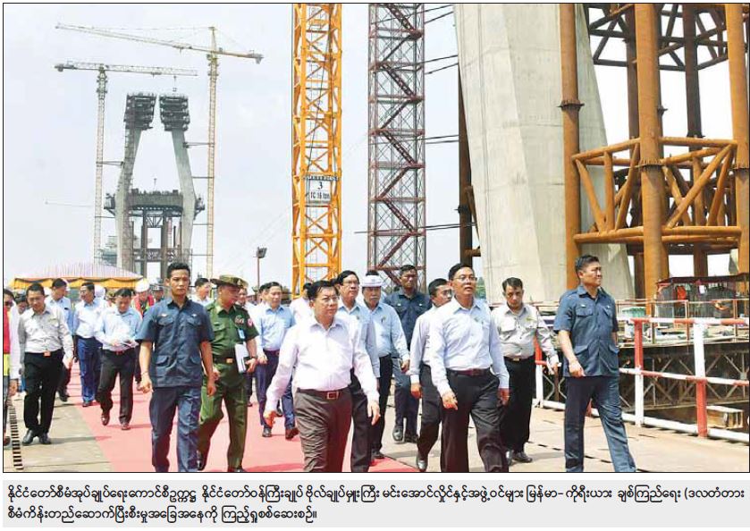 ယင်းနောက် နိုင်ငံတော်စီမံအုပ်ချုပ်ရေးကောင်စီဥက္ကဋ္ဌ နိုင်ငံတော်ဝန်ကြီးချုပ်နှင့် အဖွဲ့ဝင်များသည် တံတားတည်ဆောက်ရေးစီမံကိန်းရှိ ရန်ကုန်ဘက်ခြမ်း Main Bridge Pylon 2 နေရာတွင် လုပ်ငန်းဆောင်ရွက်နေမှု အခြေအနေများကို လိုက်လံကြည့်ရှုစစ်ဆေးရာ တာဝန်ရှိသူများ၏ ရှင်းလင်းတင်ပြမှုများအပေါ် လိုအပ်သည်များလမ်းညွှန်မှာကြားသည်။