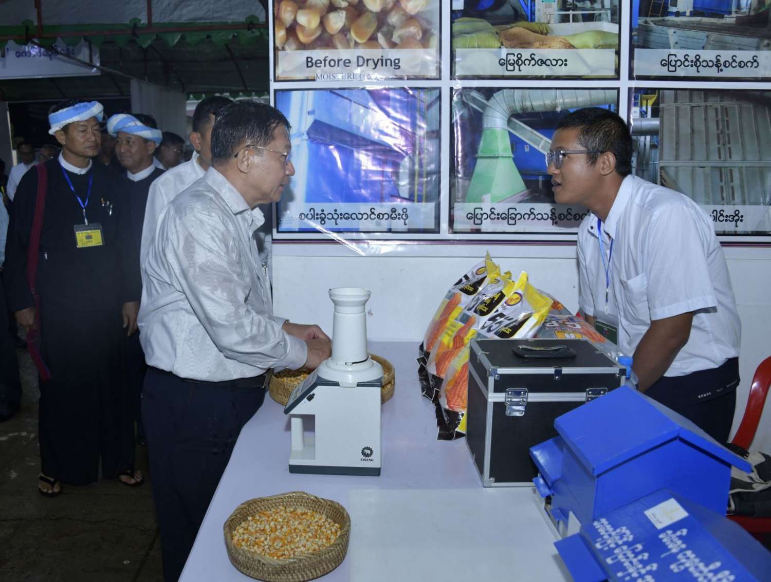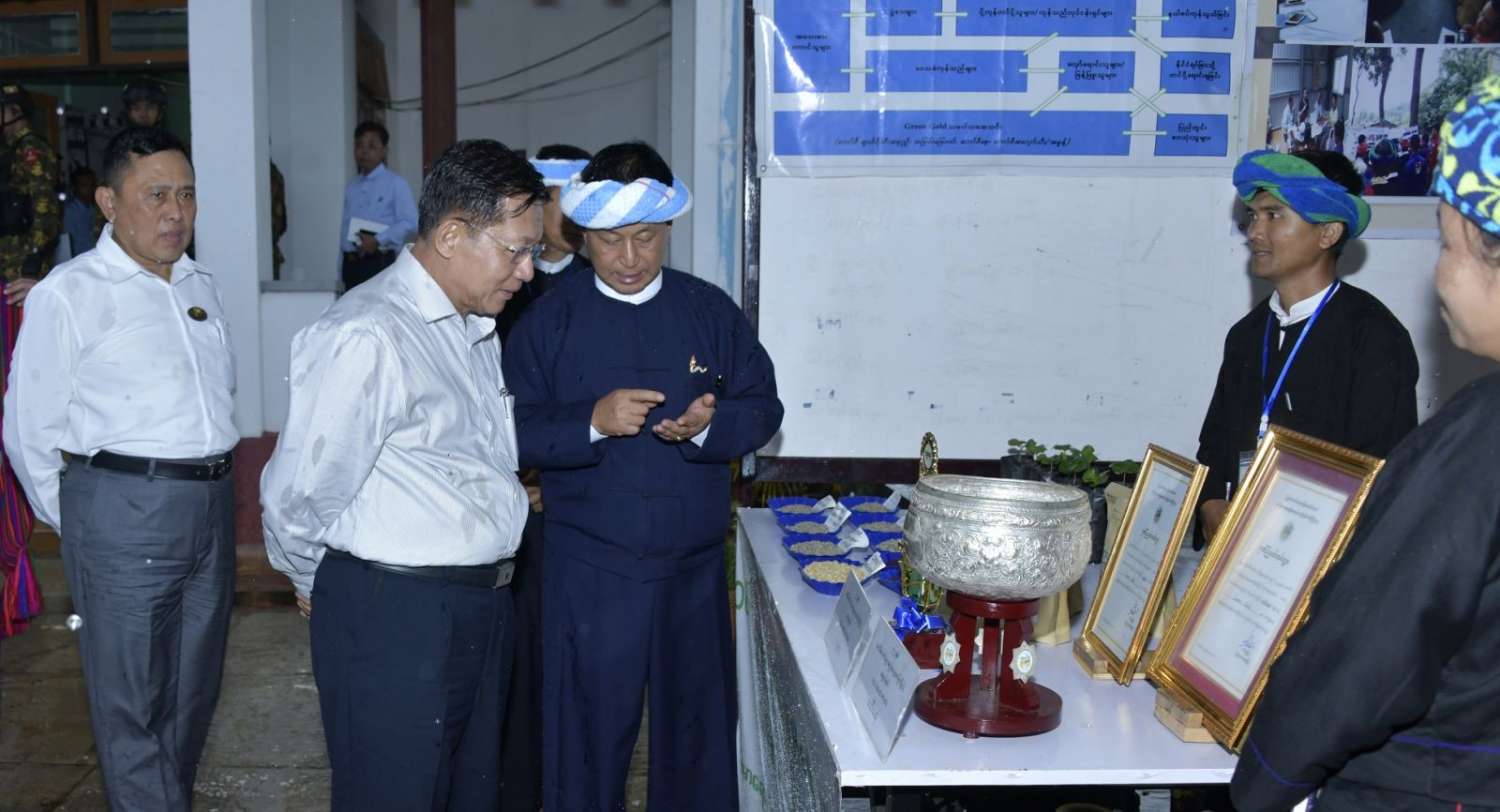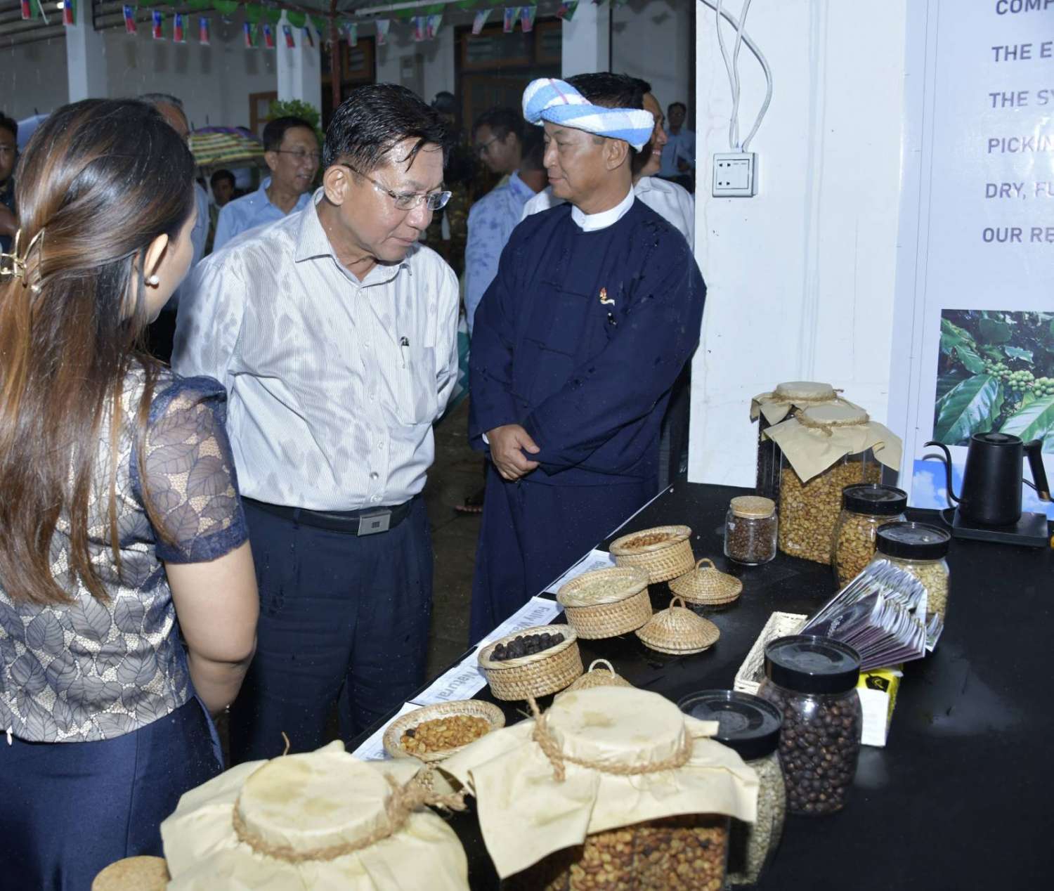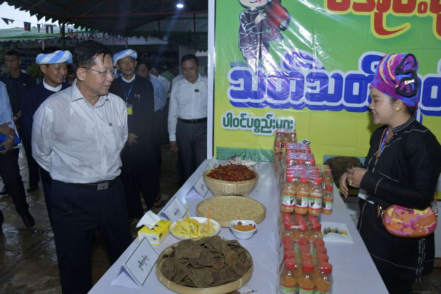 ယင်းနောက် နိုင်ငံတော်စီမံအုပ်ချုပ်ရေးကောင်စီဥက္ကဋ္ဌ နိုင်ငံတော်ဝန်ကြီးချုပ်သည် ခင်းကျင်းပြသထားသည့် ဒေသထွက်ကုန်ပစ္စည်းများ၊ စားသောက်ကုန်၊ လူသုံးကုန်၊ စက်မှုလက်မှုထုတ်ကုန်၊ ရိုးရာလက်မှုထုတ်ကုန်များ၊ အဝတ်အထည်များ စသည့်ထုတ်ကုန်ပစ္စည်းများ ခင်းကျင်းပြသထားရှိမှုများကို ပြကွက်တစ်ခုချင်းစီအလိုက် စိတ်ဝင်တစားဖြင့်လေ့လာခဲ့ပြီး ဈေးကွက်ရရှိမှုအခြေအနေများကို မေးမြန်းဆွေးနွေးရာ လုပ်ငန်းအလိုက် စီးပွားရေးလုပ်ငန်းရှင်များက လိုက်လံရှင်းလင်းတင်ပြခဲ့သည်။