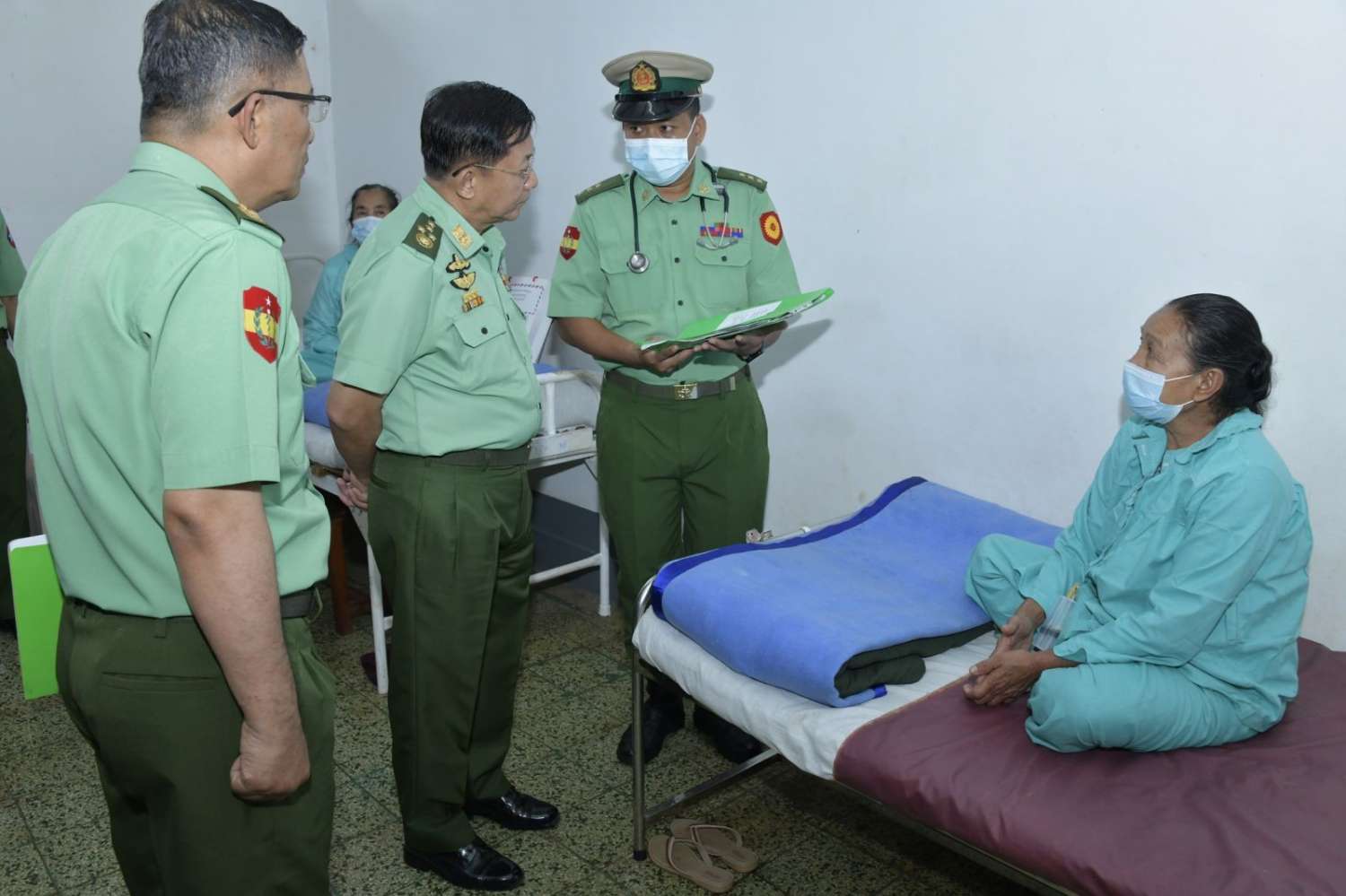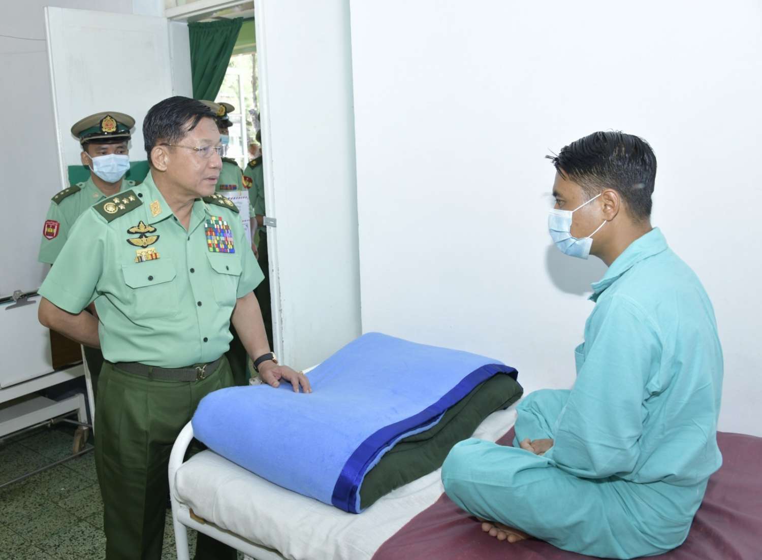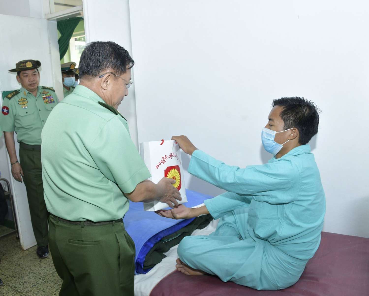 ယနေ့နံနက်ပိုင်းတွင်လည်း နိုင်ငံတော်စီမံအုပ်ချုပ်ရေးကောင်စီဥက္ကဋ္ဌ တပ်မတော်ကာကွယ်ရေးဦးစီးချုပ်နှင့်အဖွဲ့ဝင်များသည် ရှမ်းပြည်နယ်(တောင်ပိုင်း)၊ တောင်ကြီးမြို့ရှိ နယ်မြေခံတပ်မတော်ဆေးရုံသို့သွားရောက်၍ ဆေးရုံတက်ရောက်ကုသမှုခံယူ လျက်ရှိသည့် အရာရှိ၊ စစ်သည်၊ မိသားစုဝင်များ၊ မြန်မာနိုင်ငံရဲတပ်ဖွဲ့ဝင်များ၏ ကျန်းမာရေးအခြေအနေများကို တစ်ဦးချင်းရင်းရင်းနှီးနှီးမေးမြန်း အားပေးစကားပြောကြားကာ စားသောက်ဖွယ်ရာပစ္စည်းများပေးအပ်ခဲ့ကြောင်း သတင်းရရှိသည်။