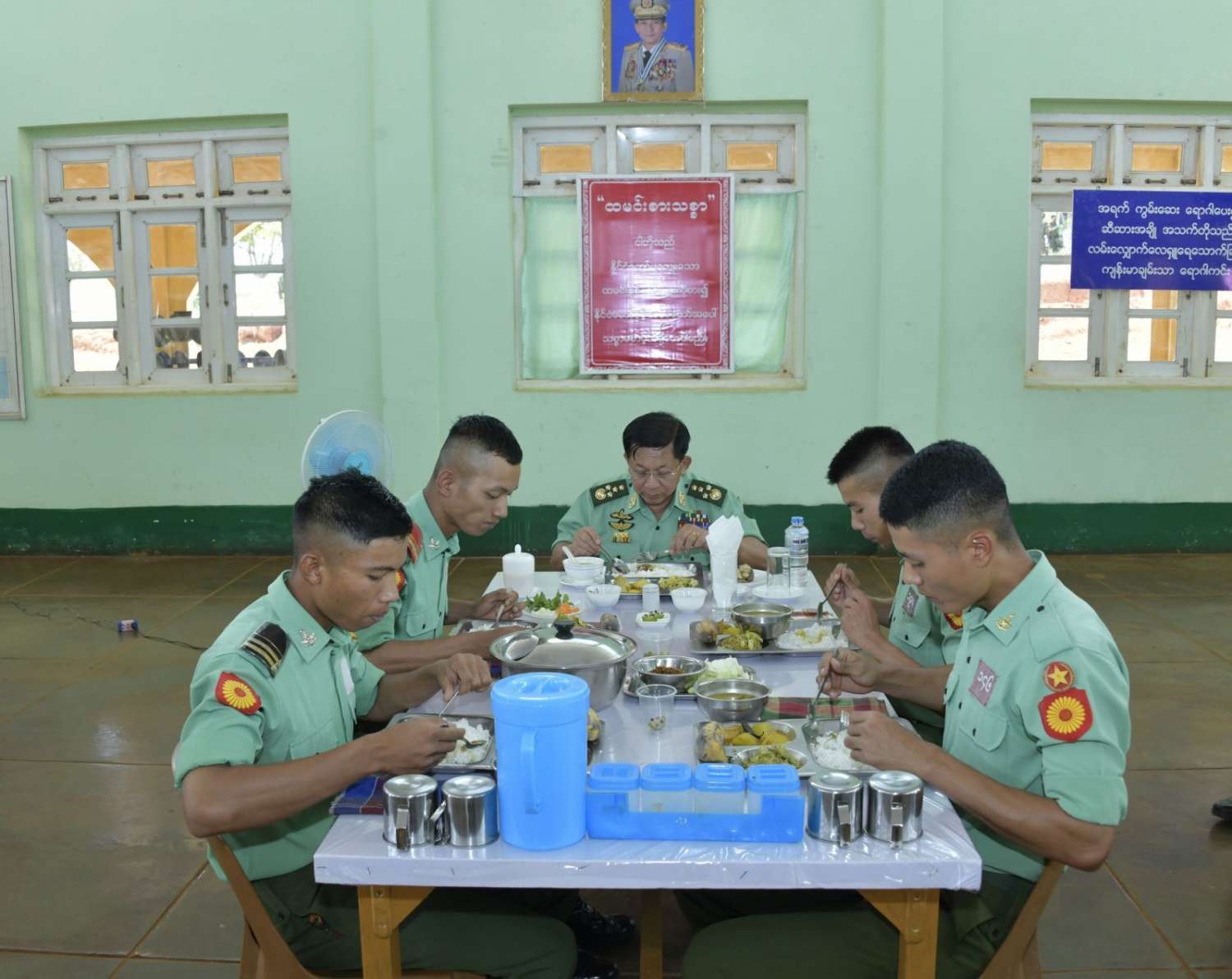 ထို့နောက် နိုင်ငံတော်စီမံအုပ်ချုပ်ရေးကောင်စီဥက္ကဋ္ဌ တပ်မတော်ကာကွယ်ရေးဦးစီးချုပ်နှင့် အဖွဲ့ဝင်များသည် တပ်မတော်ကွန်ပျူတာနှင့် နည်းပညာသိပ္ပံ သင်တန်းသား စားရိပ်သာ၌ သင်တန်းသားများနှင့်အတူ နေ့လယ်စာကို အတူတကွသုံးဆောင်ခဲ့ကြပြီး သင်တန်းသားများအား ရင်းရင်းနှီးနှီးနှုတ်ဆက်ခဲ့ကြသည်။