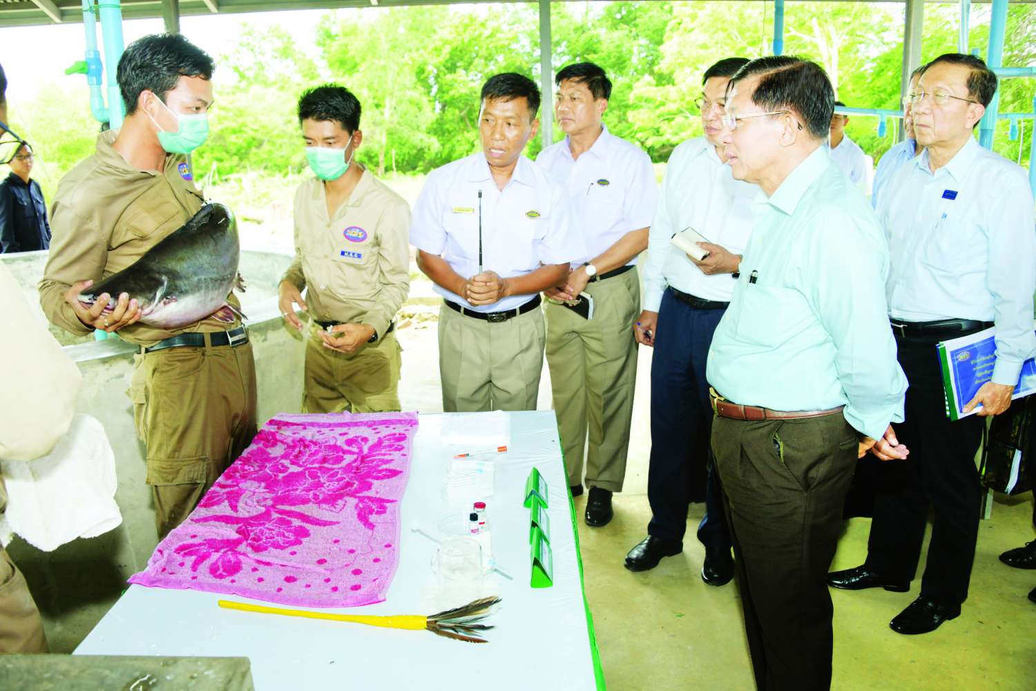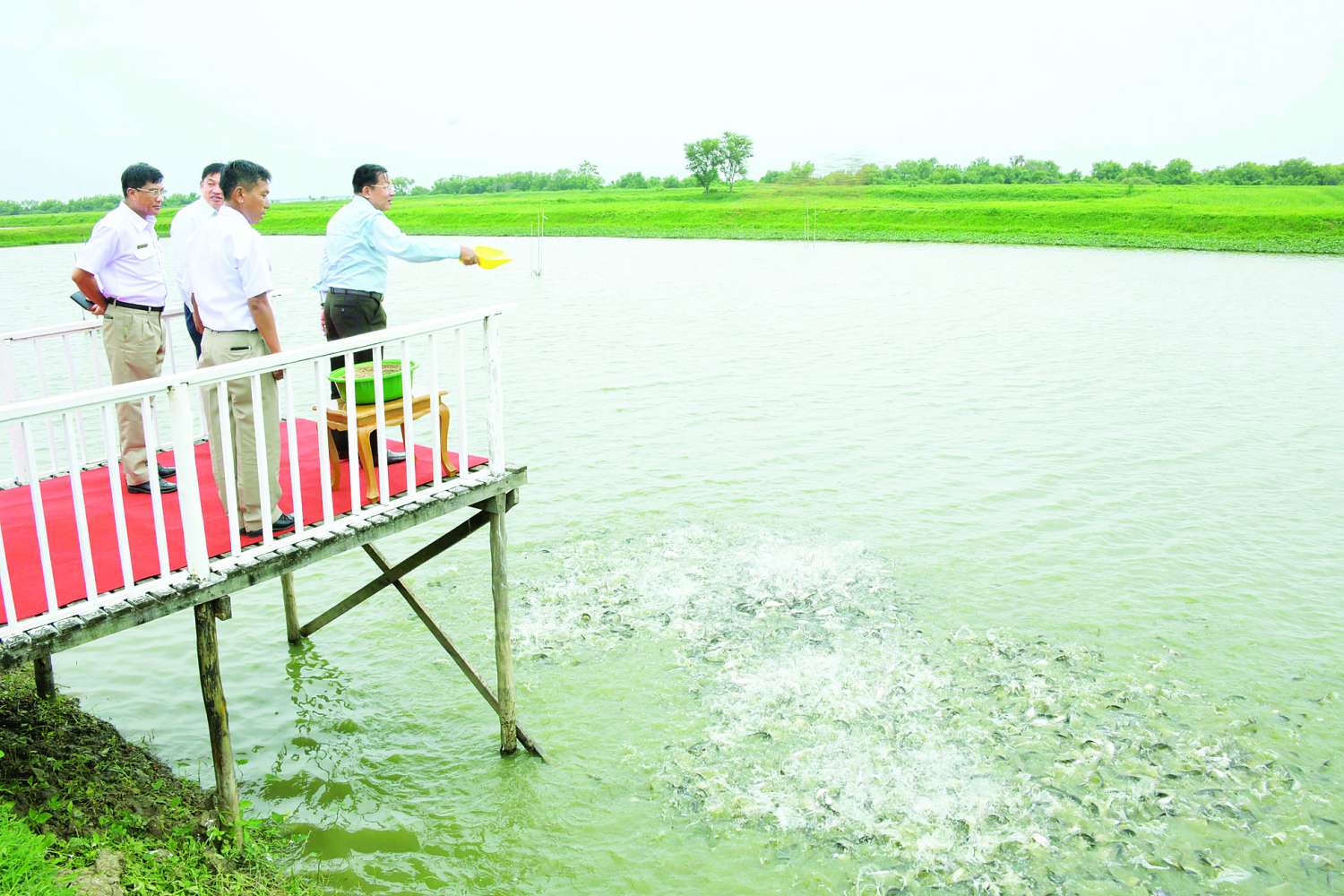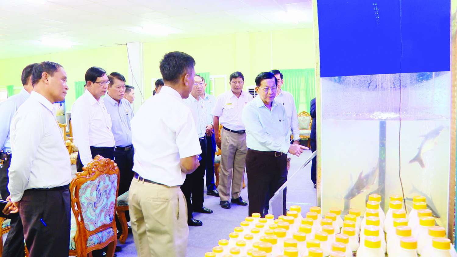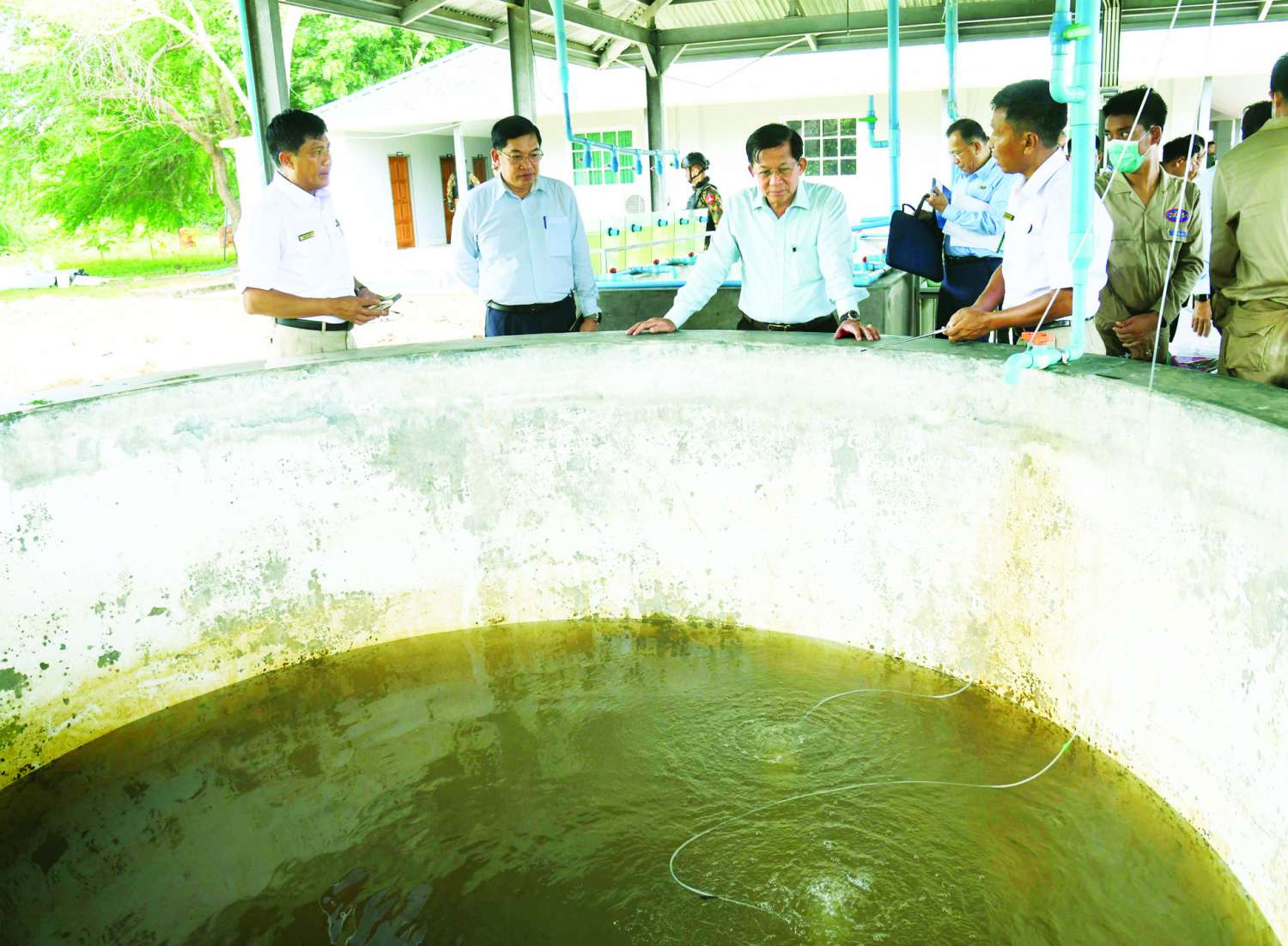 ယင်းနောက် နိုင်ငံတော်စီမံအုပ်ချုပ်ရေးကောင်စီဥက္ကဋ္ဌ နိုင်ငံတော်ဝန်ကြီးချုပ်နှင့် အဖွဲ့ဝင်များသည် မွေးမြူရေးဇုန်အတွင်းရှိ ငါးသားဖောက်လုပ်ငန်း ဆောင်ရွက်နေမှု၊ ငါးမွေးမြူထားရှိမှုနှင့် ဘဲမွေးမြူထားရှိမှုအခြေအနေများအား လှည့်လည်ကြည့်ရှုစစ်ဆေးပြီး တာဝန်ရှိသူများ၏ တင်ပြချက်များအပေါ် နိုင်ငံတော်စီမံအုပ်ချုပ်ရေးကောင်စီဥက္ကဋ္ဌ နိုင်ငံတော်ဝန်ကြီးချုပ်ကလိုအပ်သည်များ လမ်းညွှန်မှာကြားခဲ့ပြီးနောက် ခင်းကျင်းပြသထားသည့် ငါးမွေးမြူရေးလုပ်ငန်းအဆင့်ဆင့်ကိုကြည့်ရှု၍ တာဝန်ရှိသူများနှင့် ကုန်ထုတ်လုပ်မှုများနှင့် ရန်ကုန်မြို့တော်စားရေရိက္ခာဖူလုံမှုရှိစေရး သုံးသပ်ဆွေးနွေးခဲ့ကြောင်း သတင်းရရှိသည်။