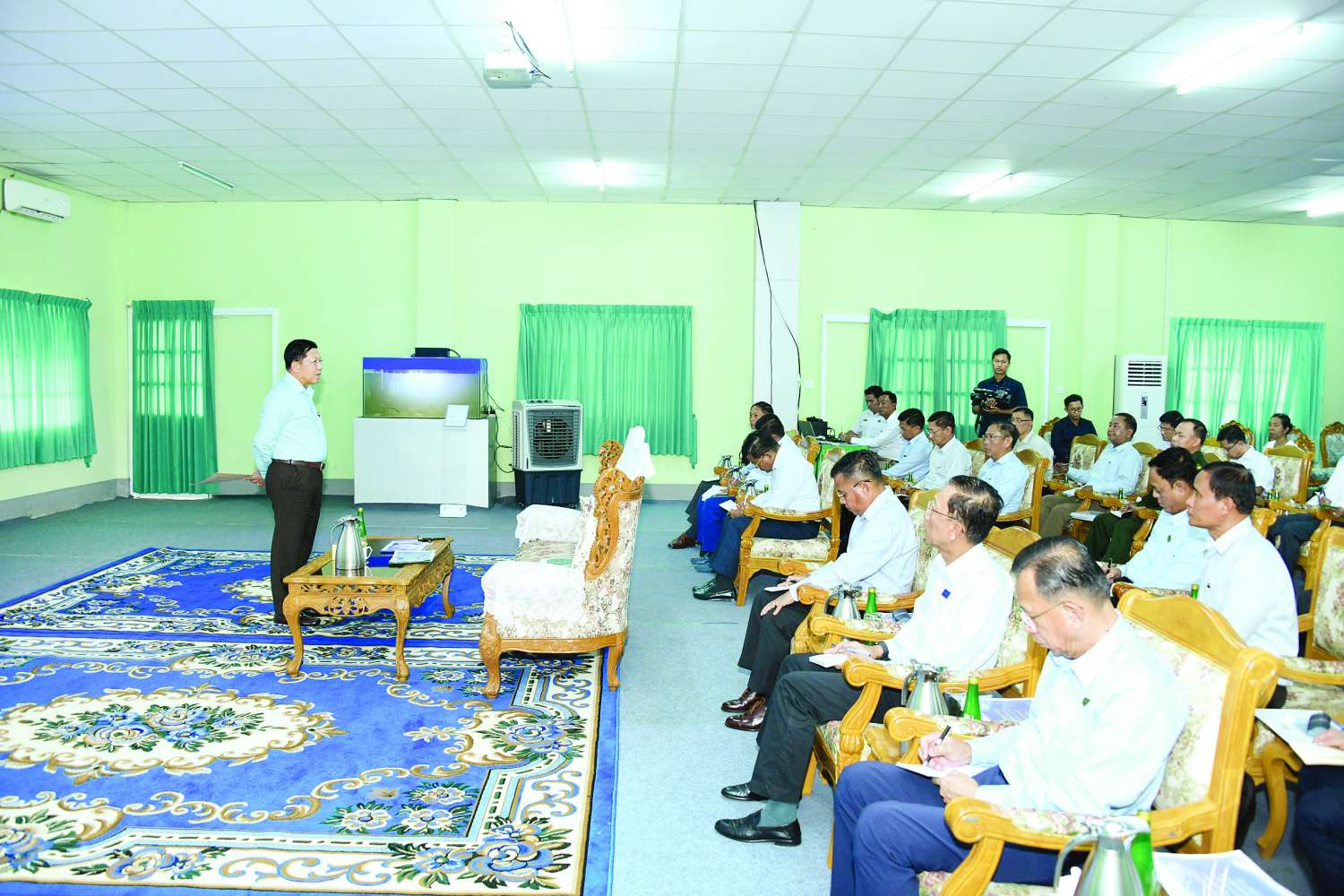 ဦးစွာ နိုင်ငံတော်စီမံအုပ်ချုပ်ရေးကောင်စီဥက္ကဋ္ဌ နိုင်ငံတော်ဝန်ကြီးချုပ်အား ရှင်းလင်းဆောင်၌ မြန်မာစီးပွားရေးကော်ပိုရေးရှင်းဥက္ကဋ္ဌ ဒုတိယဗိုလ်ချုပ်ကြီးညိုစော၊ မြန်မာ့ စီးပွားရေးဦးပိုင်အများနှင့်သက်ဆိုင်သော ကုမ္ပဏီလီမိတက်ဥက္ကဋ္ဌ ဒုတိယဗိုလ်ချုပ်ကြီး ဆန်းဦး၊ ရန်ကုန်တိုင်းဒေသကြီးဝန်ကြီးချုပ်၊ ရန်ကုန်တိုင်းစစ်ဌာနချုပ်တိုင်းမှူးနှင့် တာဝန်ရှိသူများက သီလဝါဘက်စုံ စိုက်ပျိုးမွေးမြူရေးဇုန်၊ ၂၆ မိုင် ဘက်စုံစိုက်ပျိုးမွေးမြူရေးဇုန်၊ တွံ့တေးမြို့နယ်ရှိ ရွှေမုယင်းငါးကန်နှင့် ငွေပင်လယ်မွေးမြူရေးနှင့် ရေလုပ်ငန်းတို့၏ လုပ်ငန်းဆောင်ရွက်နေမှုအခြေအနေများ၊ ဘက်စုံစိုက်ပျိုးမွေးမြူရေးဇုန်များ အကောင်အထည်ဖော်ဆောင်ရွက်ခဲ့မှု၊ ဆောင်ရွက်ပြီးစီးပြီး လုပ်ငန်းလည်ပတ်နေမှုနှင့် ဈေးကွက်အတွင်းသို့ သက်သာသောနှုန်းထားများဖြင့် ဖြန့်ဖြူးရောင်းချပေးလျက်ရှိမှု အခြေအနေများ၊ သီလဝါစိုက်ပျိုး မွေးမြူရေးဇုန်မှ ထွက်ရှိသည့် ကြက်ဥ၊ ဘဲဥများအား သဘာဝဘေးဒဏ်သင့်ခဲ့ရသည့်ဒေသများ၌ သက်သာသောနှုန်းထားများဖြင့် သွားရောက်ရောင်းချပေးလျက်ရှိသည့် အခြေအနေများ၊ ရန်ကုန်တိုင်းဒေသကြီးအတွင်း စိုက်ပျိုးမွေးမြူရေးလုပ်ငန်းများ ဆောင်ရွက်ထားရှိမှုနှင့် သား၊ ငါး ထုတ်လုပ်မှုအပေါ် စားသုံးနိုင်မှုအခြေအနေများ၊ ရန်ကုန်တိုင်းစစ်ဌာနချုပ်၏ စိုက်ပျိုးမွေးမြူရေးလုပ်ငန်းများ ဆောင်ရွက်လျက်ရှိမှု အခြေအနေများ၊ နိုင်ငံတော်စီမံအုပ်ချုပ်ရေးကောင်စီဥက္ကဋ္ဌ နိုင်ငံတော်ဝန်ကြီးချုပ်၏လမ်းညွှန်ချက်များကို အကောင်အထည်ဖော်ဆောင်ရွက်နေမှု အခြေအနေများနှင့်ပတ်သက်၍ အသီးသီးရှင်းလင်းတင်ပြကြသည်။