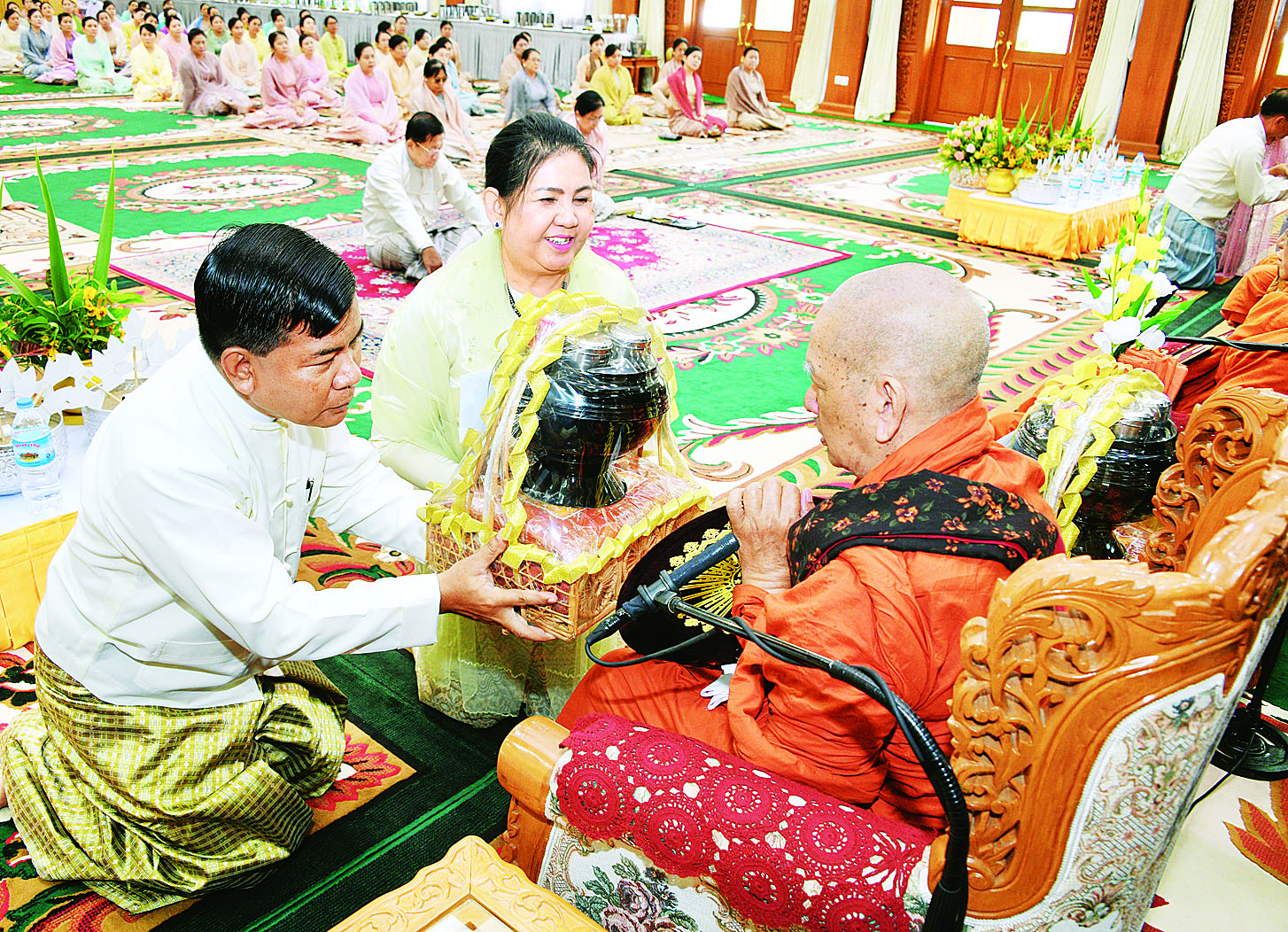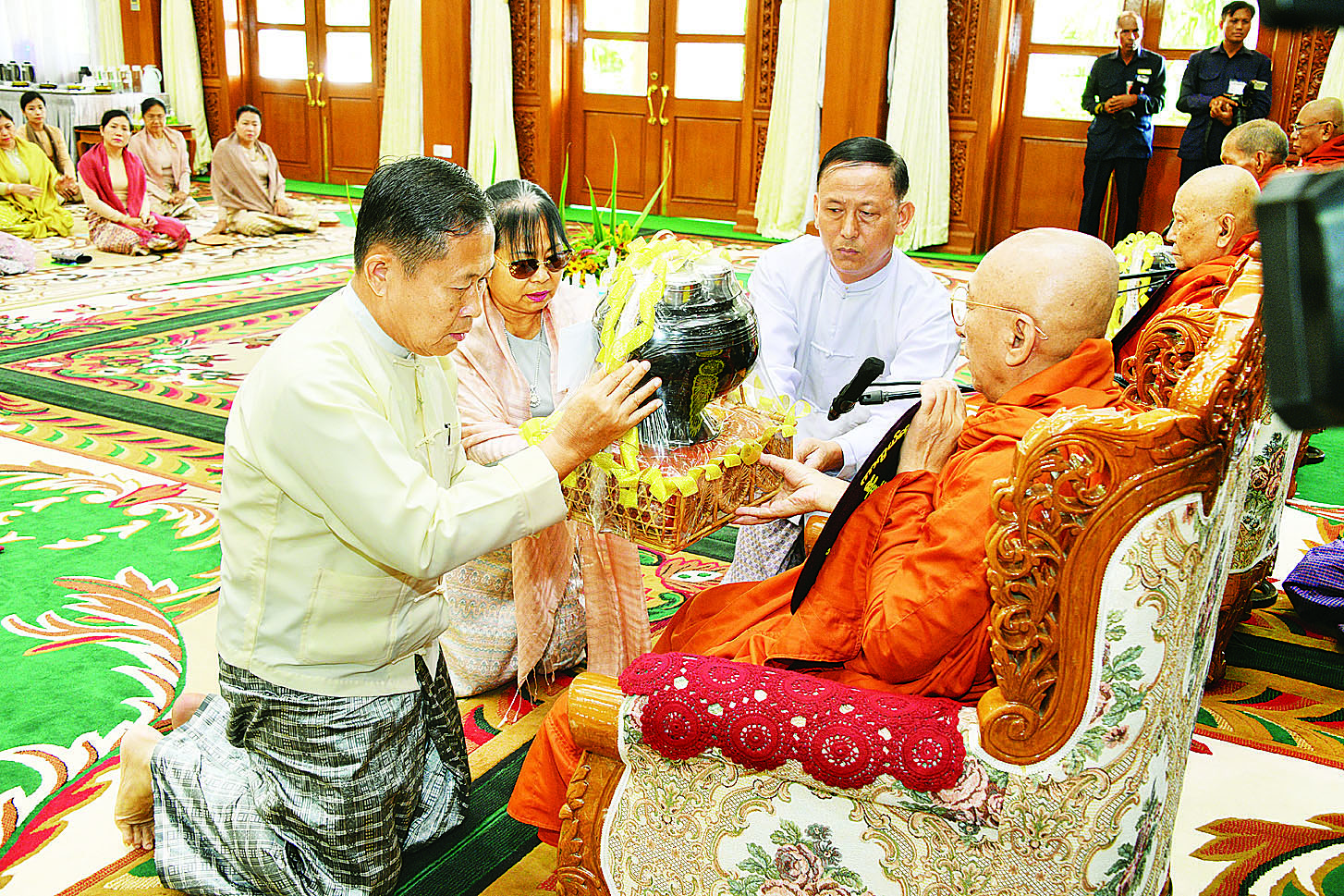 အဆိုပါ အခမ်းအနားသို့ နိုင်ငံတော်သံဃမဟာနာယကအဖွဲ့ အကျိုးတော်ဆောင် ရန်ကုန်တိုင်းဒေသကြီး သန်လျင်မြို့ မင်းကျောင်းပထမပြန် စာသင်တိုက်ပဓာနနာယက၊ အဂ္ဂမဟာပဏ္ဍိတ အဂ္ဂမဟာသဒ္ဓမ္မဇောတိကဓဇ ဒေါက်တာ ဘဒ္ဒန္တစန္ဒိမာဘိဝံသ ဆရာတော်ကြီးအမှူးပြုသော ဥပ္ပါတ သန္တိစေတီတော်ကြီး၏ ဩဝါဒါစရိယဆရာတော်ကြီးများအပါအဝင် ပင့်ဖိတ်ထားသည့် ဆရာတော်ကြီး ၂၇ ပါး ကြွရောက်ချီးမြှင့်တော်မူကြပြီး နိုင်ငံတော်စီမံအုပ်ချုပ်ရေးကောင်စီဥက္ကဋ္ဌ တပ်မတော်ကာကွယ်ရေးဦးစီးချုပ်နှင့် ဇနီးတို့နှင့်အတူ နိုင်ငံတော်စီမံအုပ်ချုပ်ရေးကောင်စီဒုတိယဥက္ကဋ္ဌ ဒုတိယတပ်မတော်ကာကွယ်ရေးဦးစီးချုပ် ကာကွယ်ရေးဦးစီးချုပ်(ကြည်း) ဒုတိယဗိုလ်ချုပ်မှူးကြီး စိုးဝင်းနှင့်ဇနီး ဒေါ်သန်းသန်းနွယ်၊ ညှိနှိုင်းကွပ်ကဲရေးမှူး(ကြည်း၊ ရေ၊ လေ) ဗိုလ်ချုပ်ကြီး မောင်မောင်အေးနှင့် ဇနီး၊ ကာကွယ်ရေးဦးစီးချုပ် (လေ)နှင့် ဇနီး၊ ပြည်ထောင်စုအဆင့်ပုဂ္ဂိုလ်များနှင့် ဇနီးများ၊ ကာကွယ်ရေးဦးစီးချုပ်ရုံးမှ အဆင့်မြင့်တပ်မတော်အရာရှိကြီးများနှင့်ဇနီးများ၊ တာဝန်ရှိသူများ တက်ရောက်ကြသည်။