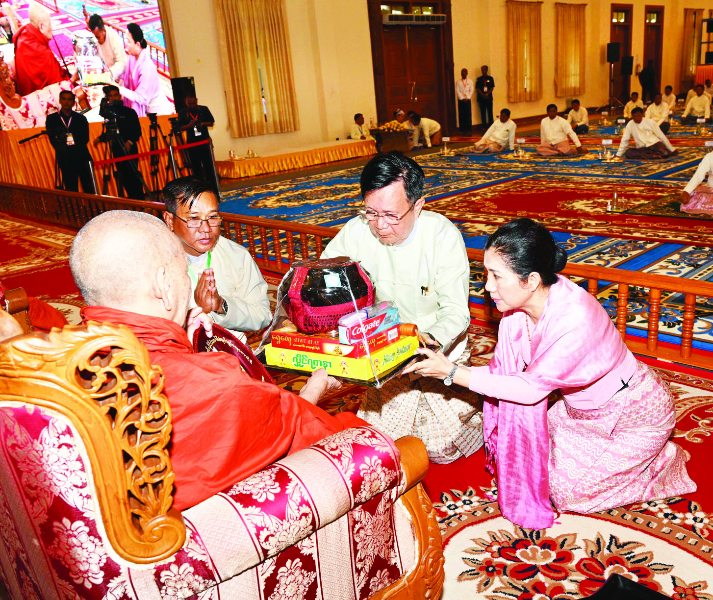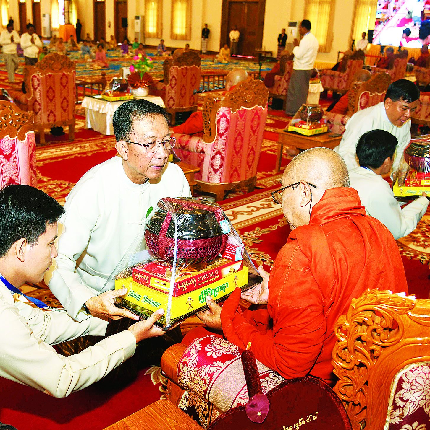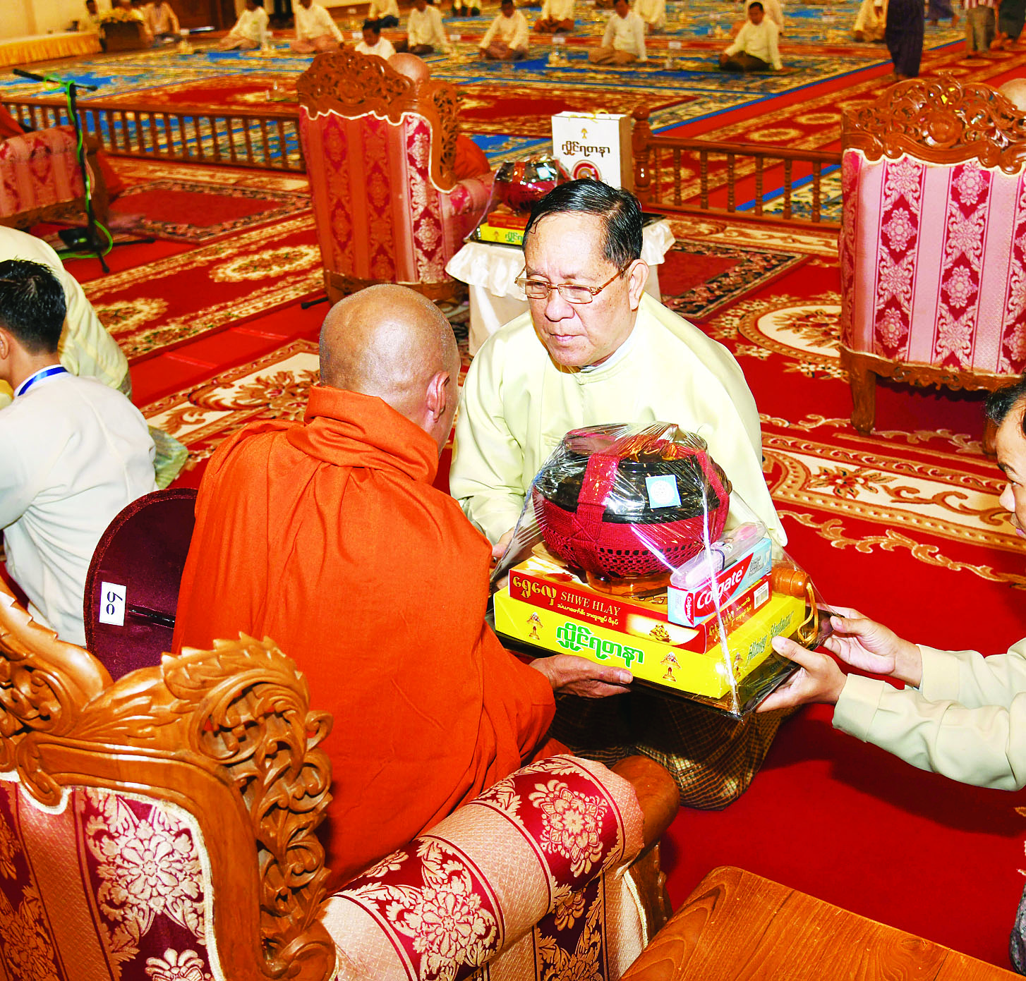 ထို့နောက် နိုင်ငံတော်စီမံအုပ်ချုပ်ရေးကောင်စီ ဒုတိယဥက္ကဋ္ဌ ဒုတိယဝန်ကြီးချုပ်နှင့်ဇနီးတို့က နိုင်ငံတော်သံဃမဟာနာယကအဖွဲ့ ဒုတိယဥက္ကဋ္ဌ၊ ရှမ်းပြည်နယ်၊ ကျောက်မဲမြို့၊ သီဟိုဠ်ပရိယတ္တိ စာသင်တိုက် ပဓာနနာယက၊ အဂ္ဂမဟာပဏ္ဍိတ ဒေါက်တာဘဒ္ဒန္တစန္ဒနသာရ ဆရာတော်ကြီးထံ ဝါဆိုသင်္ကန်းနှင့်လှူဖွယ်ပစ္စည်းများကို ဆက်ကပ်လှူဒါန်းသည်။ ဆက်လက်ပြီး ကောင်စီအတွင်းရေးမှူးနှင့်ဇနီး၊ တွဲဖက်အတွင်းရေးမှူးနှင့်ဇနီး၊ ကောင်စီဝင်များနှင့်ဇနီးများ၊ ပြည်ထောင်စုအဆင့် ပုဂ္ဂိုလ်များ၊ ပြည်ထောင်စုဝန်ကြီးများ၊ ညှိနှိုင်းကွပ်ကဲရေးမှူး(ကြည်း၊ ရေ၊လေ) နှင့် အဆင့်မြင့်တပ်မတော်အရာရှိကြီးများက ဆရာတော်၊ သံဃာတော်များထံ ဝါဆိုသင်္ကန်းနှင့်လှူဖွယ်ပစ္စည်းများကို အသီးသီးဆက်ကပ်လှူဒါန်းကြသည်။
