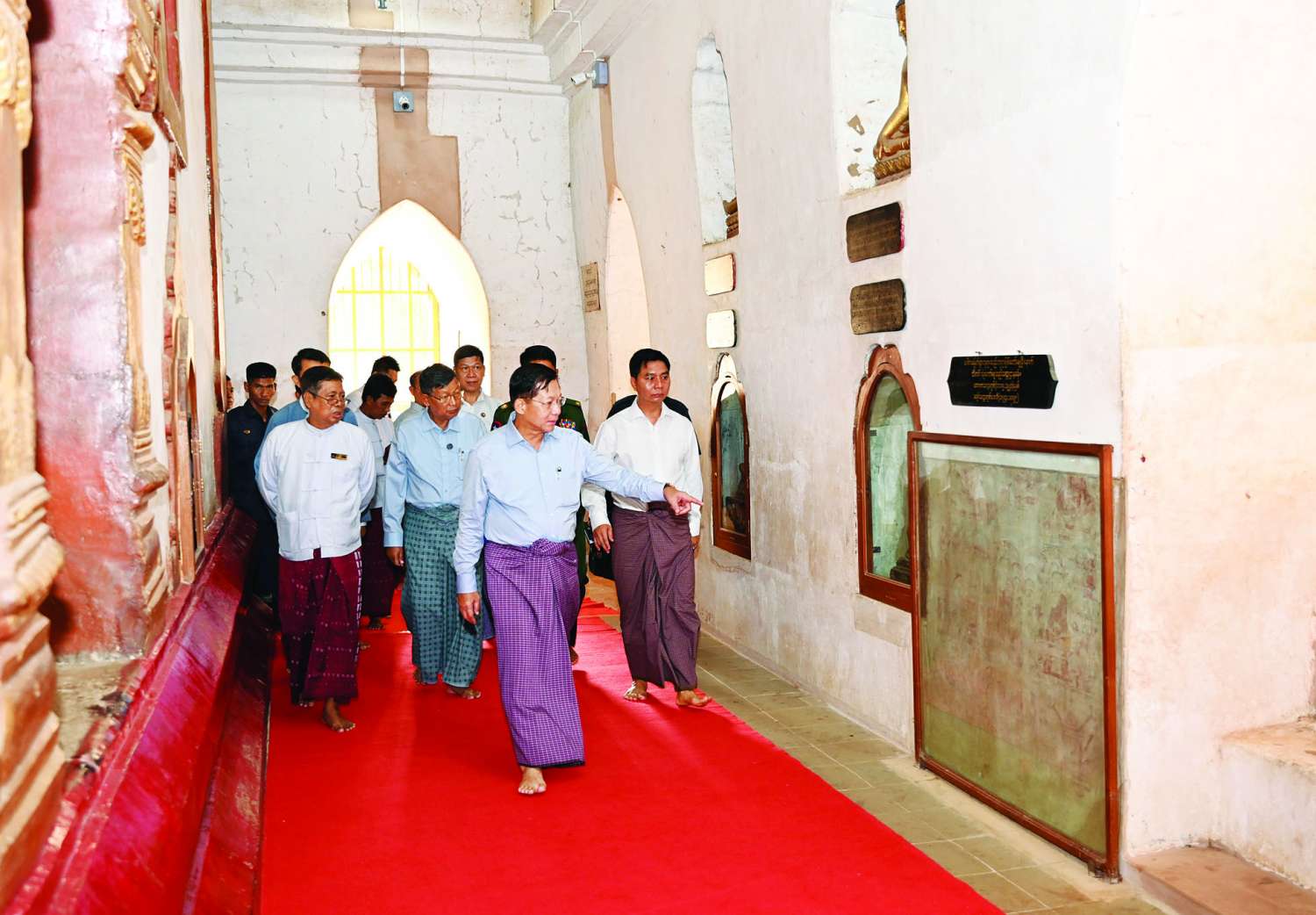 နိုင်ငံတော်စီမံအုပ်ချုပ်ရေးကောင်စီဥက္ကဋ္ဌ နိုင်ငံတော်ဝန်ကြီးချုပ် ဗိုလ်ချုပ်မှူးကြီး မင်းအောင်လှိုင်သည် ယနေ့နံနက်ပိုင်းတွင် ဇနီး ဒေါ်ကြူကြူလှ၊ ကောင်စီတွဲဖက်အတွင်းရေးမှူး ဒုတိယဗိုလ်ချုပ်ကြီး ရဲဝင်းဦးနှင့်ဇနီး၊ ပြည်ထောင်စုဝန်ကြီးများ၊ မန္တလေးတိုင်းဒေသကြီး ဝန်ကြီးချုပ် ဦးမျိုးအောင်၊ ညှိနှိုင်းကွပ်ကဲရေးမှူး (ကြည်း၊ရေ၊လေ)နှင့်ဇနီး၊ ကာကွယ်ရေးဦးစီးချုပ်ရုံးမှ အဆင့်မြင့်တပ်မတော်အရာရှိကြီးများနှင့် ဇနီးများ၊ တာဝန်ရှိသူများလိုက်ပါ၍ သဘာဝဘေးအန္တရာယ်ဖြစ်ပေါ်မှုကြောင့် ရေဝင်၊ ရေဝပ်မှုနှင့် ထိခိုက်ပျက်စီးမှုများဖြစ်ပေါ်ခဲ့သည့် ပုဂံရှေးဟောင်းယဉ်ကျေးမှုနယ်မြေအတွင်း ပြုပြင်ထိန်းသိမ်းထားရှိမှုအခြေအနေများကို သွားရောက်ကြည့်ရှုစစ်ဆေးပြီး လိုအပ်သည်များ လမ်းညွှန်မှာကြားသည်။