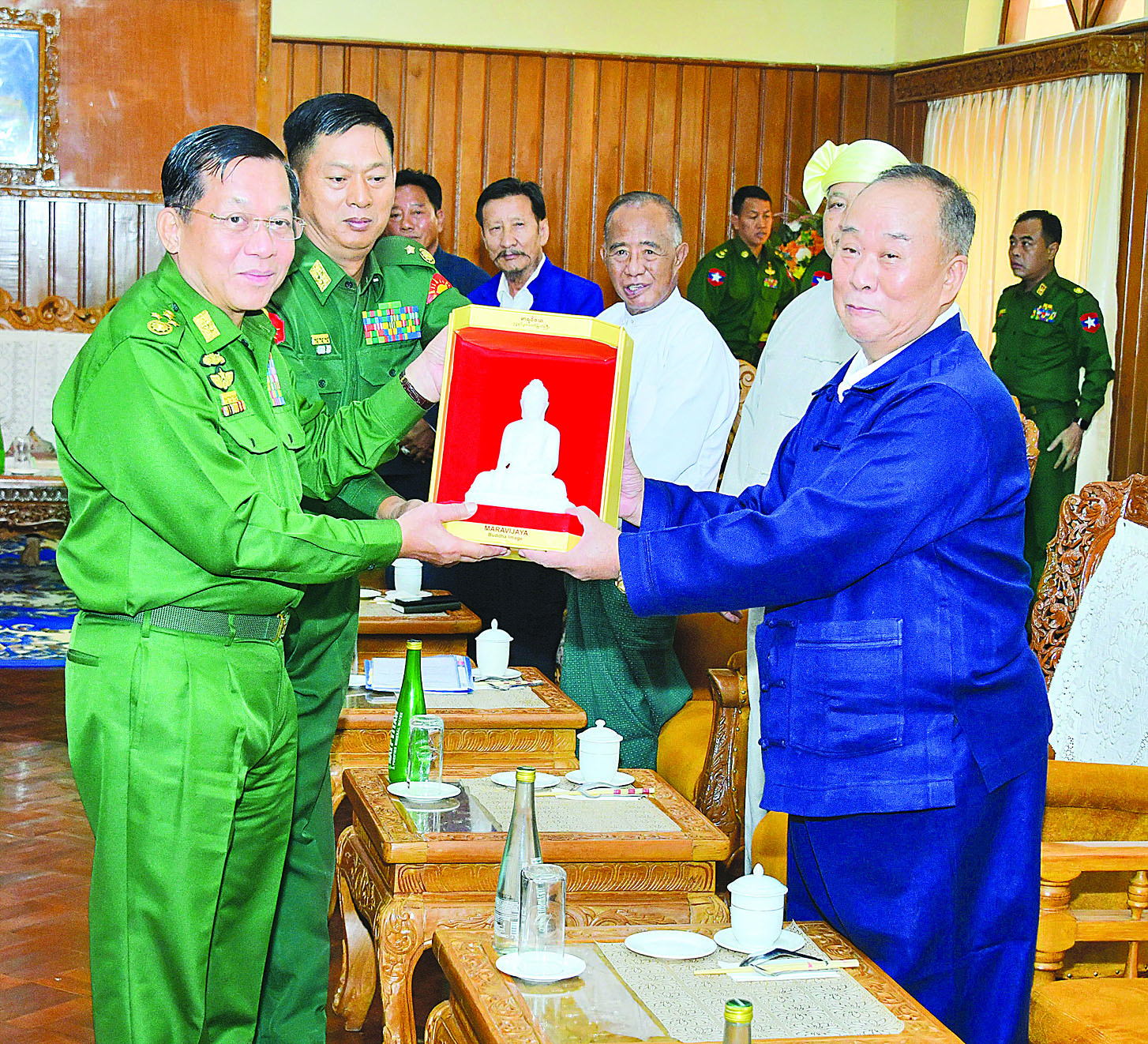 တွေ့ဆုံပွဲအပြီးတွင် နိုင်ငံတော်စီမံအုပ်ချုပ်ရေးကောင်စီဥက္ကဋ္ဌ တပ်မတော် ကာကွယ်ရေးဦးစီးချုပ်က တက်ရောက်လာကြသည့် ပြည်သူ့စစ်ဌာနေတပ်ဖွဲ့ဝင်များအား မာရဝိဇယဗုဒ္ဓရုပ်ပွားတော်မြတ်ပုံစံတူ ကျောက်ဆစ်ဗုဒ္ဓရုပ်ပွားတော်မြတ်များကို ဓမ္မလက်ဆောင်အဖြစ်နှင့် စားသောက်ဖွယ်ရာ ပစ္စည်းများကို ပေးအပ်ခဲ့ရာ အသီးသီး လက်ခံရယူခဲ့ကြပြီး ရင်းရင်းနှီးနှီး နှုတ်ဆက်ခဲ့ကြကြောင်း သတင်းရရှိသည်။