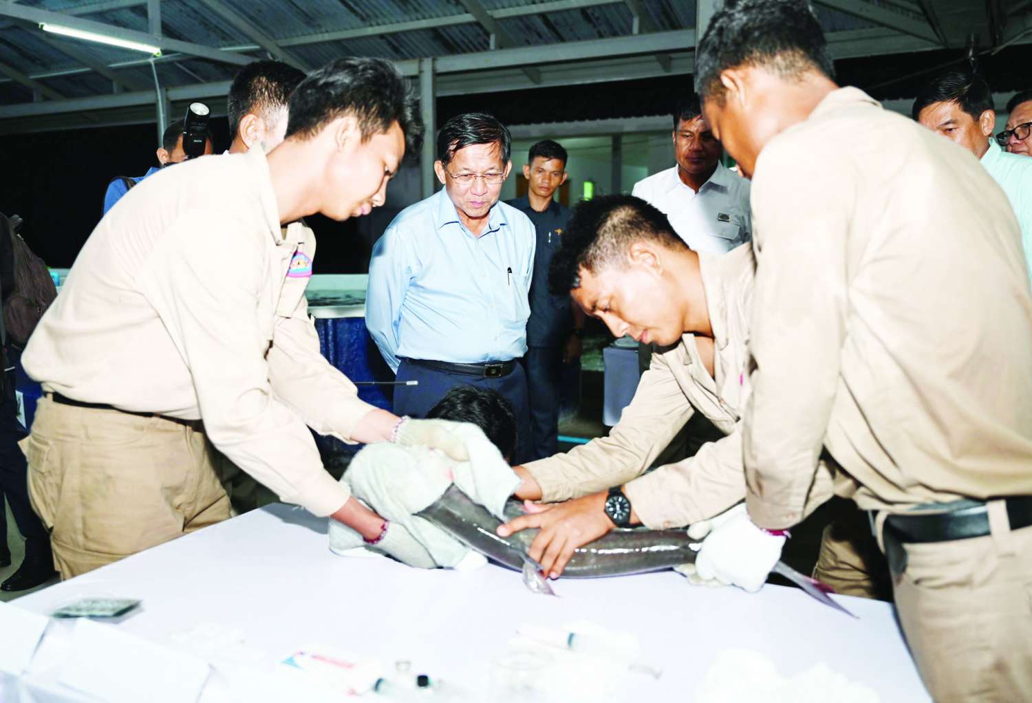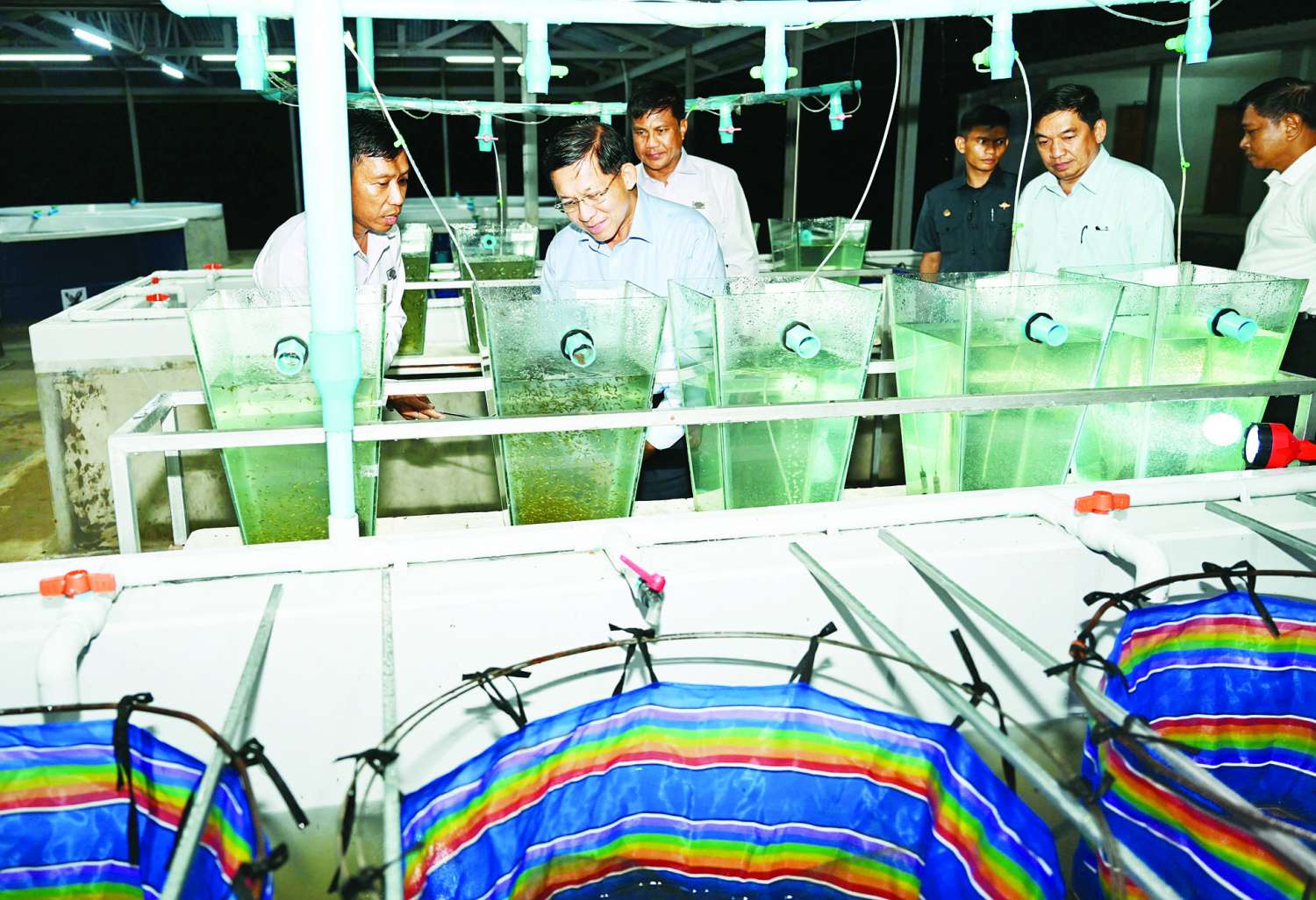 ယင်းနောက် နိုင်ငံတော်စီမံအုပ်ချုပ်ရေးကောင်စီဥက္ကဋ္ဌ နိုင်ငံတော်ဝန်ကြီးချုပ်သည် မွေးမြူရေးဇုန် အတွင်းရှိ ငါးသားဖောက်လုပ်ငန်းဆောင်ရွက်နေမှုနှင့် ငါးသား ပေါက်မွေးမြူထားရှိမှု အခြေအနေများအား လှည့်လည်ကြည့်ရှုစစ်ဆေးပြီး တာဝန်ရှိ သူများ၏ တင်ပြချက်များအပေါ် လိုအပ်သည်များ မှာကြားခဲ့ကြောင်း သတင်းရရှိသည်။