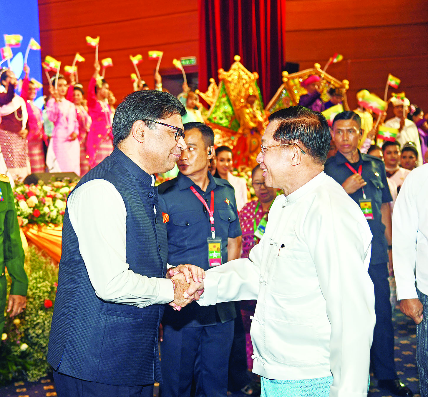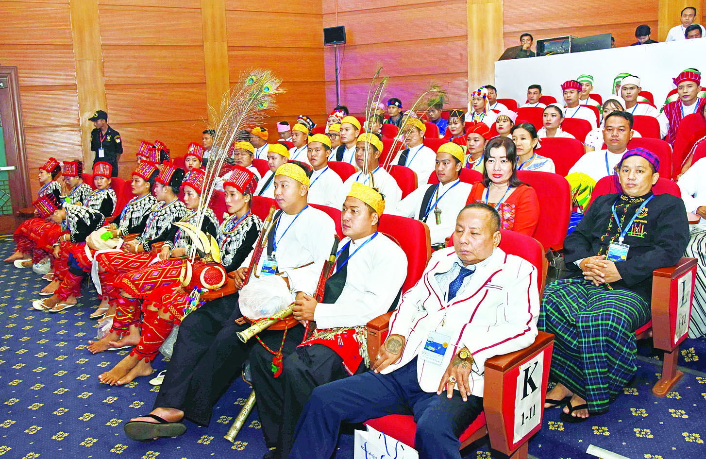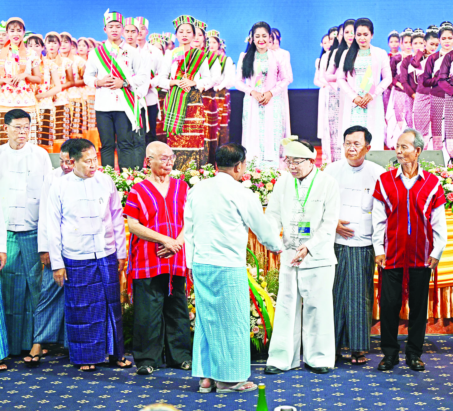 ထို့နောက် နိုင်ငံတော်စီမံအုပ်ချုပ်ရေးကောင်စီဥက္ကဋ္ဌ နိုင်ငံတော်ဝန်ကြီးချုပ် အမျိုးသားစည်းလုံးညီညွတ်ရေးနှင့် ငြိမ်းချမ်းရေးဖော်ဆောင်မှု ဗဟိုကော်မတီဥက္ကဋ္ဌက ပြန်ကြားရေးဝန်ကြီးဌာန မြန်မာ့အသံနှင့်ရုပ်မြင်သံကြား၊ သာသနာရေးနှင့်ယဉ်ကျေးမှုဝန်ကြီးဌာန၊ အနုပညာဦးစီးဌာနတို့မှ အကအဖွဲ့များနှင့် တိုင်းရင်းသားအကအဖွဲ့များကို “ငြိမ်းချမ်းရေး ဂုဏ်ပြုပန်းခြင်း” နှင့် ဂုဏ်ပြုချီးမြှင့်ငွေများ ပေးအပ်ချီးမြှင့်ပြီး တိုင်းရင်းသားအကအဖွဲ့များနှင့်အတူ စုပေါင်းမှတ်တမ်းတင် ဓာတ်ပုံရိုက်သည်။