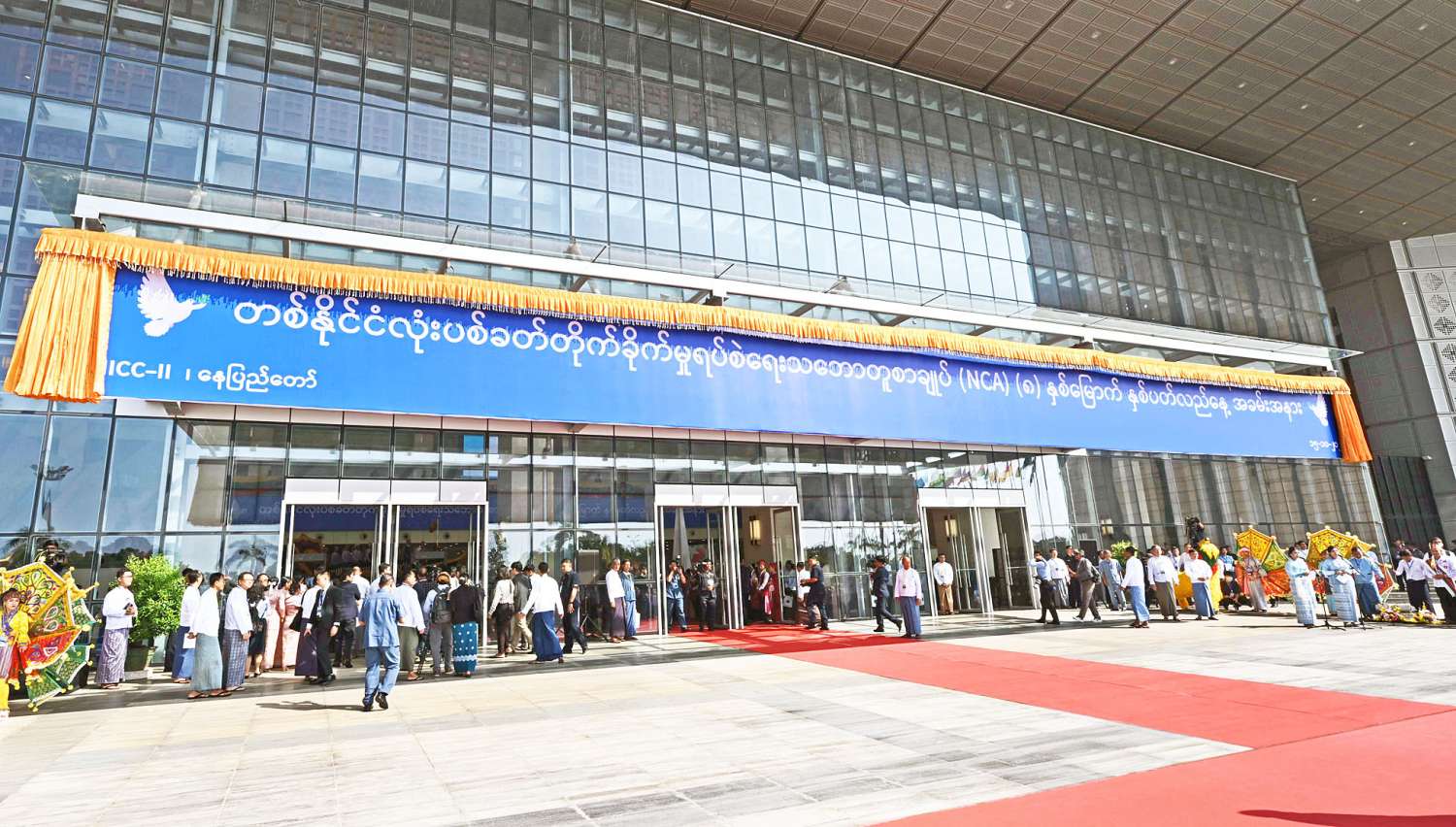 တစ်နိုင်ငံလုံးပစ်ခတ်တိုက်ခိုက်မှုရပ်စဲရေးသဘောတူစာချုပ် (NCA) (၈) နှစ်မြောက် နှစ်ပတ်လည်နေ့ အခမ်းအနားကို ယနေ့နံနက်ပိုင်းတွင် နေပြည်တော်ရှိ မြန်မာအပြည်ပြည်ဆိုင်ရာ ကွန်ဗင်းရှင်းဗဟိုဌာန (၂) (MICC – II) ၌ ကျင်းပပြုလုပ်ရာ နိုင်ငံတော်စီမံအုပ်ချုပ်ရေးကောင်စီဥက္ကဋ္ဌ နိုင်ငံတော်ဝန်ကြီးချုပ် အမျိုးသားစည်းလုံးညီညွတ်ရေးနှင့် ငြိမ်းချမ်းရေးဖော်ဆောင်မှု ဗဟိုကော်မတီဥက္ကဋ္ဌ တပ်မတော်ကာကွယ်ရေးဦးစီးချုပ် ဗိုလ်ချုပ်မှူးကြီး မင်းအောင်လှိုင် တက်ရောက်မိန့်ခွန်းပြောကြားသည်။