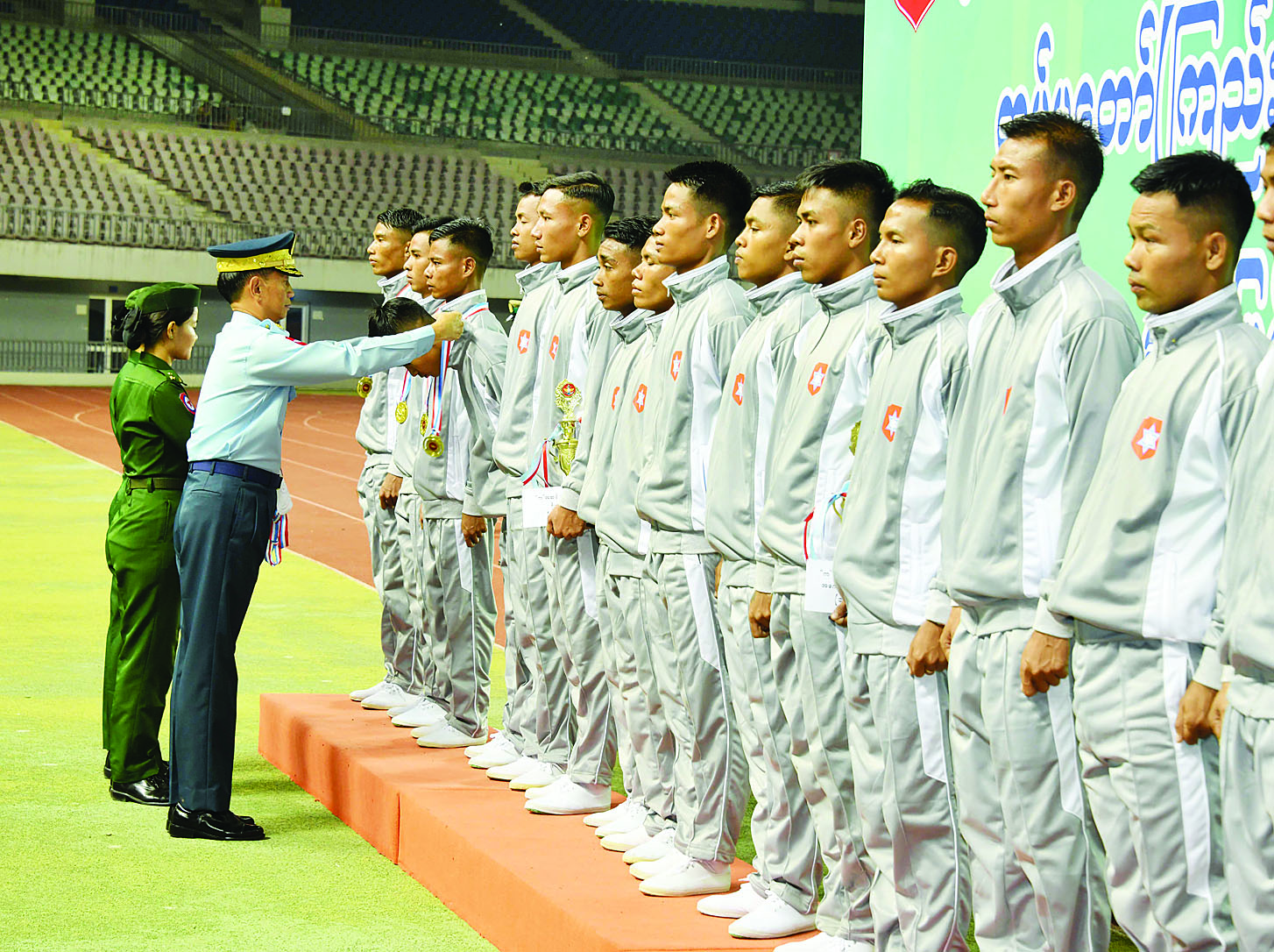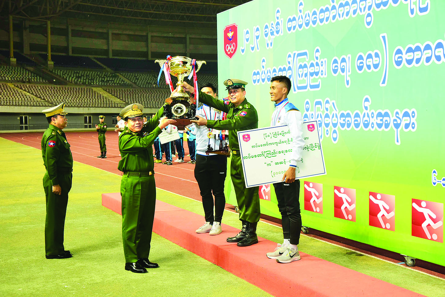 ဆက်လက်၍ (ခ) အဆင့်ပြိုင်ပွဲတွင် နေရာအလိုက် အကောင်းဆုံးအားကစားသမားဆုရရှိသူများကို ကာကွယ်ရေးဦးစီးချုပ်ရုံး (ကြည်း) မှ ဒုတိယဗိုလ်ချုပ်ကြီး တေဇကျော် က တစ်ဦးချင်း ဆုတံဆိပ် နှင့် ငွေသားဆုများကိုလည်းကောင်း၊ (က) အဆင့် ပြိုင်ပွဲတွင် နေရာအလိုက် အကောင်းဆုံး အားကစား သမားဆုရရှိသူများကို ကာကွယ်ရေးဦးစီးချုပ်ရုံးမှ ဒုတိယဗိုလ်ချုပ်ကြီး သက်ပုံက တစ်ဦးချင်းဆုတံဆိပ် နှင့် ငွေသားဆုများကိုလည်းကောင်း၊ (ခ) အဆင့်ပြိုင်ပွဲတွင် ပထမဆုရရှိသည့် တောင်ပိုင်းတိုင်းစစ်ဌာနချုပ်အသင်းမှ အားကစားသမားများကို ကာကွယ်ရေးဦးစီးချုပ် (လေ) ဗိုလ်ချုပ်ကြီး ထွန်းအောင်က တစ်ဦးချင်းဆုတံဆိပ်များကိုလည်းကောင်း၊ (က) အဆင့်ပြိုင်ပွဲတွင် ပထမဆုရရှိသည့် ကာကွယ်ရေးဦးစီးချုပ်ရုံး (ကြည်း)၊ စခန်းမှူးရုံးအသင်းမှ အားကစား သမားများကို ကာကွယ်ရေးဦးစီးချုပ်(ရေ) ဗိုလ်ချုပ်ကြီး မိုးအောင်က တစ်ဦးချင်း ဆုတံဆိပ်များကိုလည်းကောင်း ပေးအပ်ချီးမြှင့်ကြသည်။