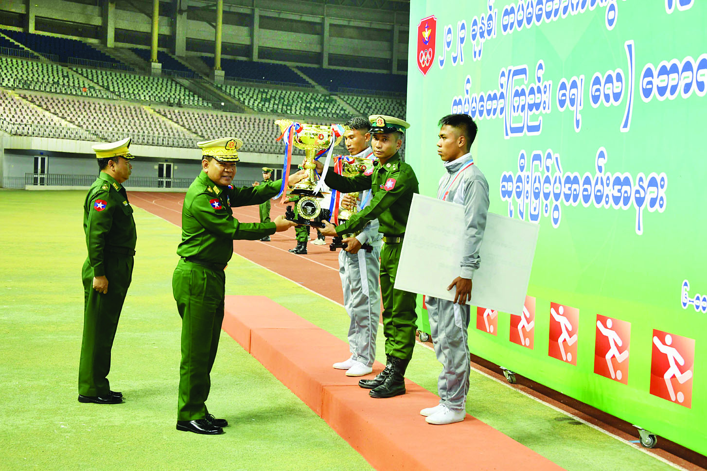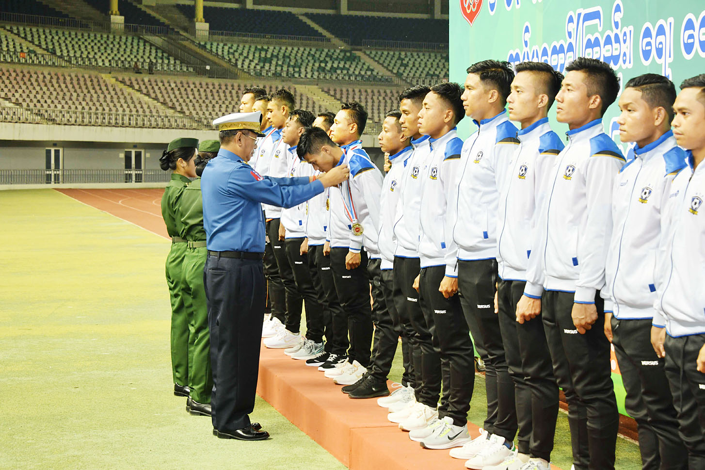 ထို့နောက် နိုင်ငံတော်စီမံအုပ်ချုပ်ရေးကောင်စီဥက္ကဋ္ဌ တပ်မတော်ကာကွယ်ရေးဦးစီးချုပ် ဗိုလ်ချုပ်မှူးကြီး မင်းအောင်လှိုင်က တပ်မတော် (ကြည်း၊ ရေ၊ လေ) ဘောလုံးပြိုင်ပွဲ (က) အဆင့်ပြိုင်ပွဲတွင် ပထမဆုကို ဆွတ်ခူးနိုင်ခဲ့သည့် ကာကွယ်ရေးဦးစီးချုပ်ရုံး (ကြည်း)၊ စခန်းမှူးရုံးအသင်းကို တပ်မတော် ကာကွယ်ရေးဦးစီးချုပ်၏ တံခွန်စိုက်ဆုဖလား၊ ဆင့်ပွားဆုဖလားနှင့် ငွေသားဆုများ ပေးအပ်ချီးမြှင့်သည်။
