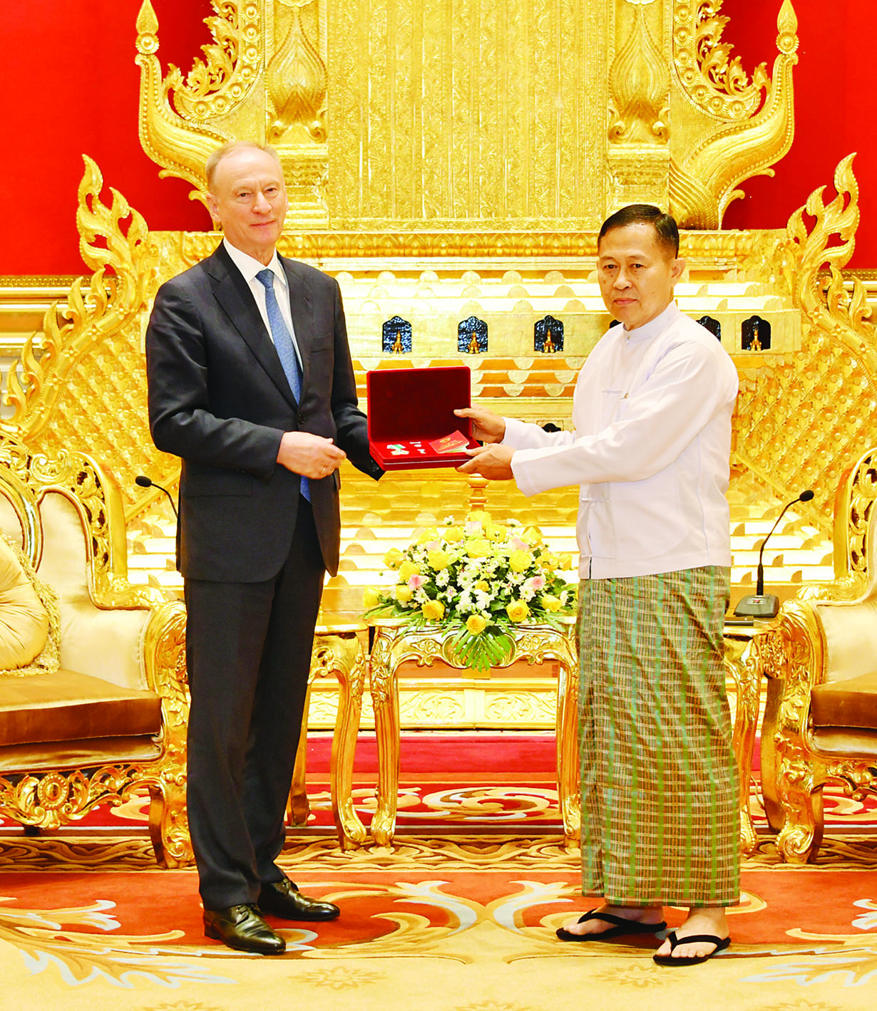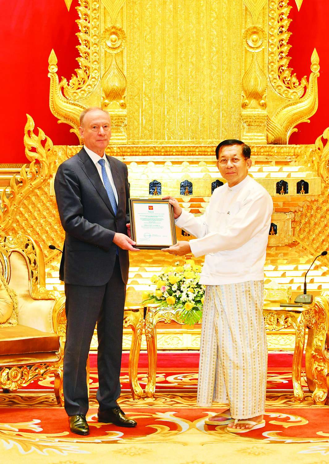 ရုရှားဖက်ဒရေးရှင်းနိုင်ငံသမ္မတ မစ္စတာဗလာဒီမာပူတင်က ချီးမြှင့်အပ်နှင်းသည့် Order of Alexander Nevsky ဘွဲ့တံဆိပ်အား နိုင်ငံတော်စီမံအုပ်ချုပ်ရေးကောင်စီဥက္ကဋ္ဌ နိုင်ငံတော်ဝန်ကြီးချုပ် ဗိုလ်ချုပ်မှူးကြီး မင်းအောင်လှိုင်ထံ ရုရှားဖက်ဒရေးရှင်းနိုင်ငံ၊ လုံခြုံရေးကောင်စီအတွင်းရေးမှူး Mr. Nikolai PATRUSHEV ယနေ့မွန်းလွဲပိုင်းတွင် နေပြည်တော်ရှိ နိုင်ငံတော်စီမံအုပ်ချုပ်ရေးကောင်စီဥက္ကဋ္ဌရုံး သံတမန်ဆောင်ဧည့်ခန်းမ၌ လာရောက်တွေ့ဆုံအပ်နှင်းပြီး နှစ်နိုင်ငံပူးပေါင်းဆောင်ရွက်မှုကဏ္ဍတိုးမြှင့်ရေးအတွက် ဆွေးနွေးသည်။