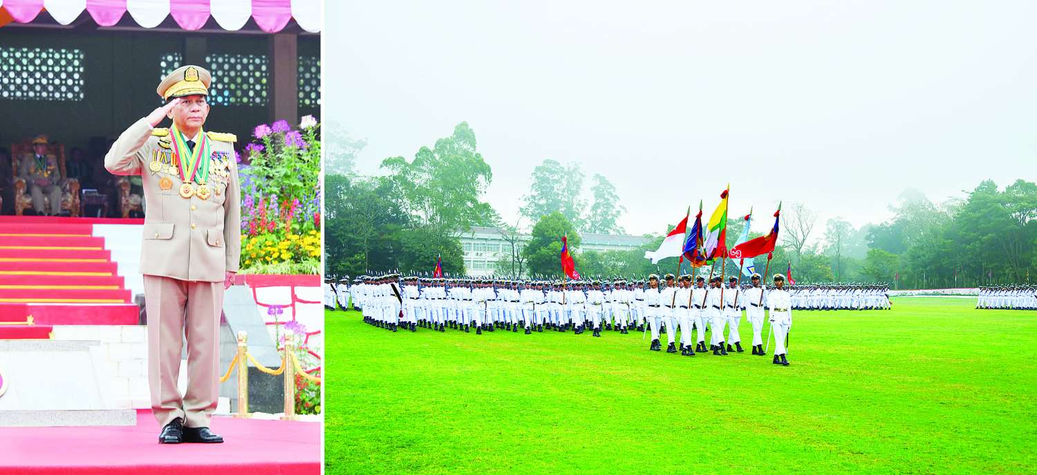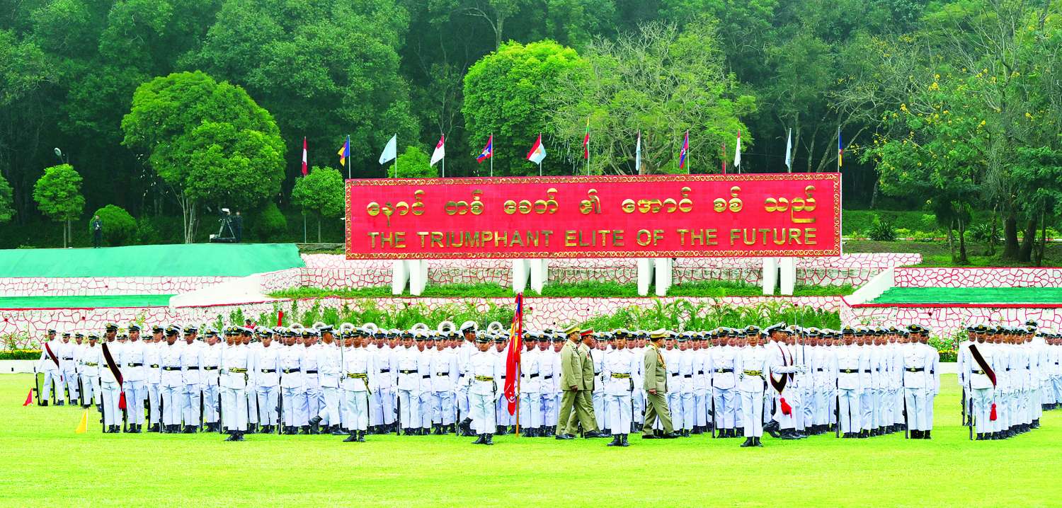 စစ်တက္ကသိုလ် ဗိုလ်လောင်းသင်တန်းအမှတ်စဉ် (၆၅) သင်တန်းဆင်းဂုဏ်ပြု စစ်ရေးပြအခမ်းအနားကို ယနေ့နံနက်ပိုင်းတွင် ပြင်ဦးလွင်မြို့ စစ်တက္ကသိုလ် စစ်ရေးပြကွင်း၌ ကျင်းပပြုလုပ်ရာ နိုင်ငံတော်စီမံအုပ်ချုပ်ရေးကောင်စီဥက္ကဋ္ဌ တပ်မတော်ကာကွယ်ရေးဦးစီးချုပ် ဗိုလ်ချုပ်မှူးကြီး သတိုးမဟာသရေစည်သူ သတိုးသီရိသုဓမ္မ မင်းအောင်လှိုင် တက်ရောက်မိန့်ခွန်းပြောကြားသည်။