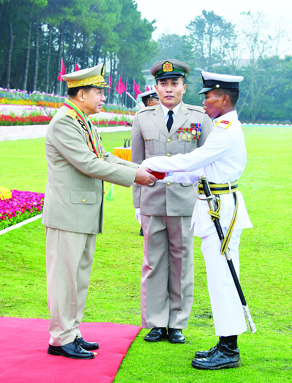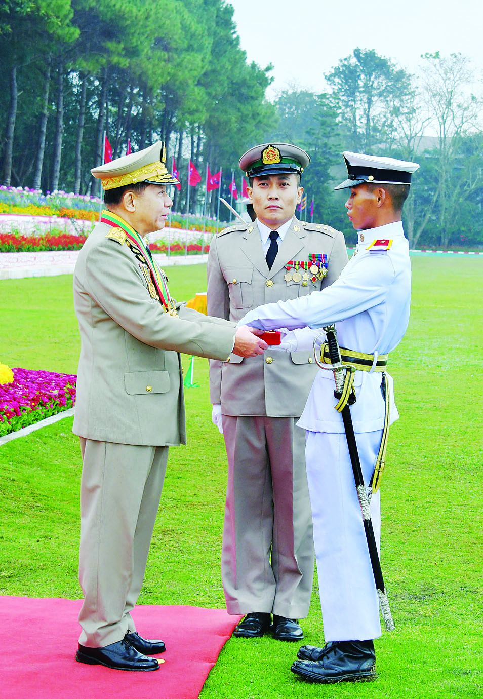 ဦးစွာ နိုင်ငံတော်စီမံအုပ်ချုပ်ရေးကောင်စီဥက္ကဋ္ဌ တပ်မတော်ကာကွယ်ရေးဦးစီးချုပ် ဗိုလ်ချုပ်မှူးကြီး သတိုးမဟာသရေစည်သူ သတိုးသီရိသုဓမ္မ မင်းအောင်လှိုင်သည် ဗိုလ်လောင်းတပ်ခွဲများ၏ အလေးပြုခြင်းကိုခံယူပြီး ကျောင်းဆင်းဗိုလ်လောင်းတပ်ခွဲများကို စစ်ဆေးသည်။