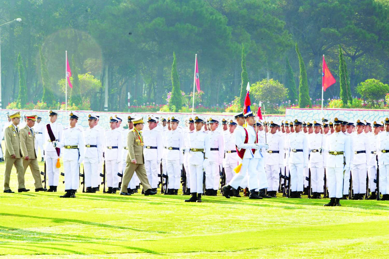 ဦးစွာ နိုင်ငံတော်စီမံအုပ်ချုပ်ရေးကောင်စီဥက္ကဋ္ဌ တပ်မတော်ကာကွယ်ရေးဦးစီးချုပ် ဗိုလ်ချုပ်မှူးကြီး သတိုးမဟာသရေစည်သူ သတိုးသီရိသုဓမ္မမင်းအောင်လှိုင်သည် ဗိုလ်လောင်းတပ်ခွဲများ၏ အလေးပြုခြင်းကိုခံယူပြီး ကျောင်းဆင်းဗိုလ်လောင်း တပ်ခွဲကိုစစ်ဆေးသည်။ ယင်းနောက် နိုင်ငံတော်စီမံအုပ်ချုပ်ရေးကောင်စီဥက္ကဋ္ဌ တပ်မတော်ကာကွယ်ရေးဦးစီးချုပ် ဗိုလ်ချုပ်မှူးကြီး သတိုးမဟာသရေစည်သူ သတိုးသီရိသုဓမ္မ မင်းအောင်လှိုင်အား ဗိုလ်လောင်းတပ်ခွဲများက အနှေးလျှောက်၊ အမြန်လျှောက်ဖြင့် ချီတက်အလေးပြုကြသည်။