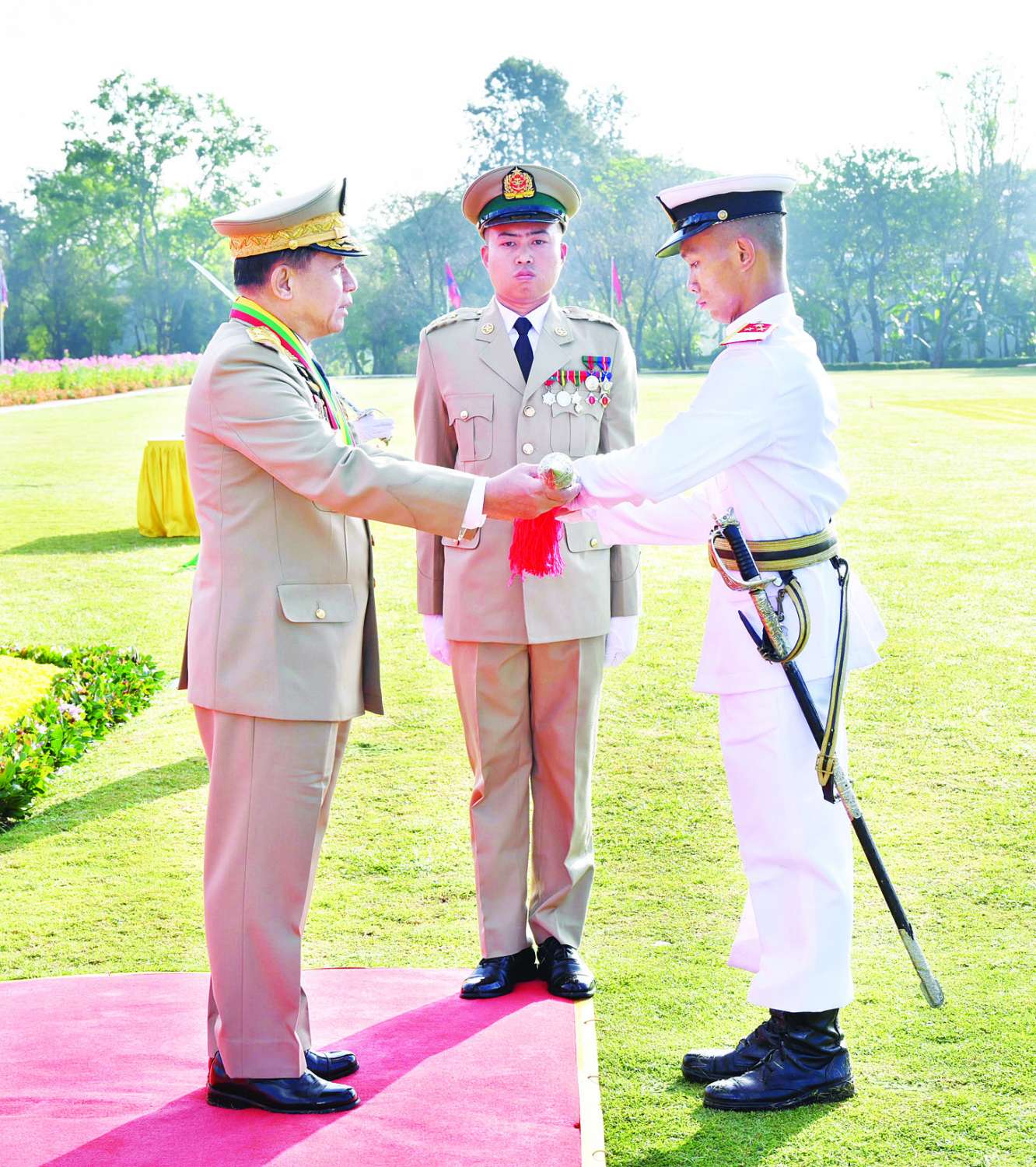 ယင်းနောက် နိုင်ငံတော်စီမံအုပ်ချုပ်ရေးကောင်စီဥက္ကဋ္ဌ တပ်မတော်ကာကွယ်ရေးဦးစီးချုပ် ဗိုလ်ချုပ်မှူးကြီး သတိုးမဟာသရေစည်သူ သတိုးသီရိသုဓမ္မ မင်းအောင်လှိုင်သည် ဗိုလ်လောင်းတပ်ခွဲများ၏ အလေးပြုခြင်းကိုခံယူပြီး စစ်ရေးပြအခမ်းအနားမှ ပြန်လည်ထွက်ခွာသည်။