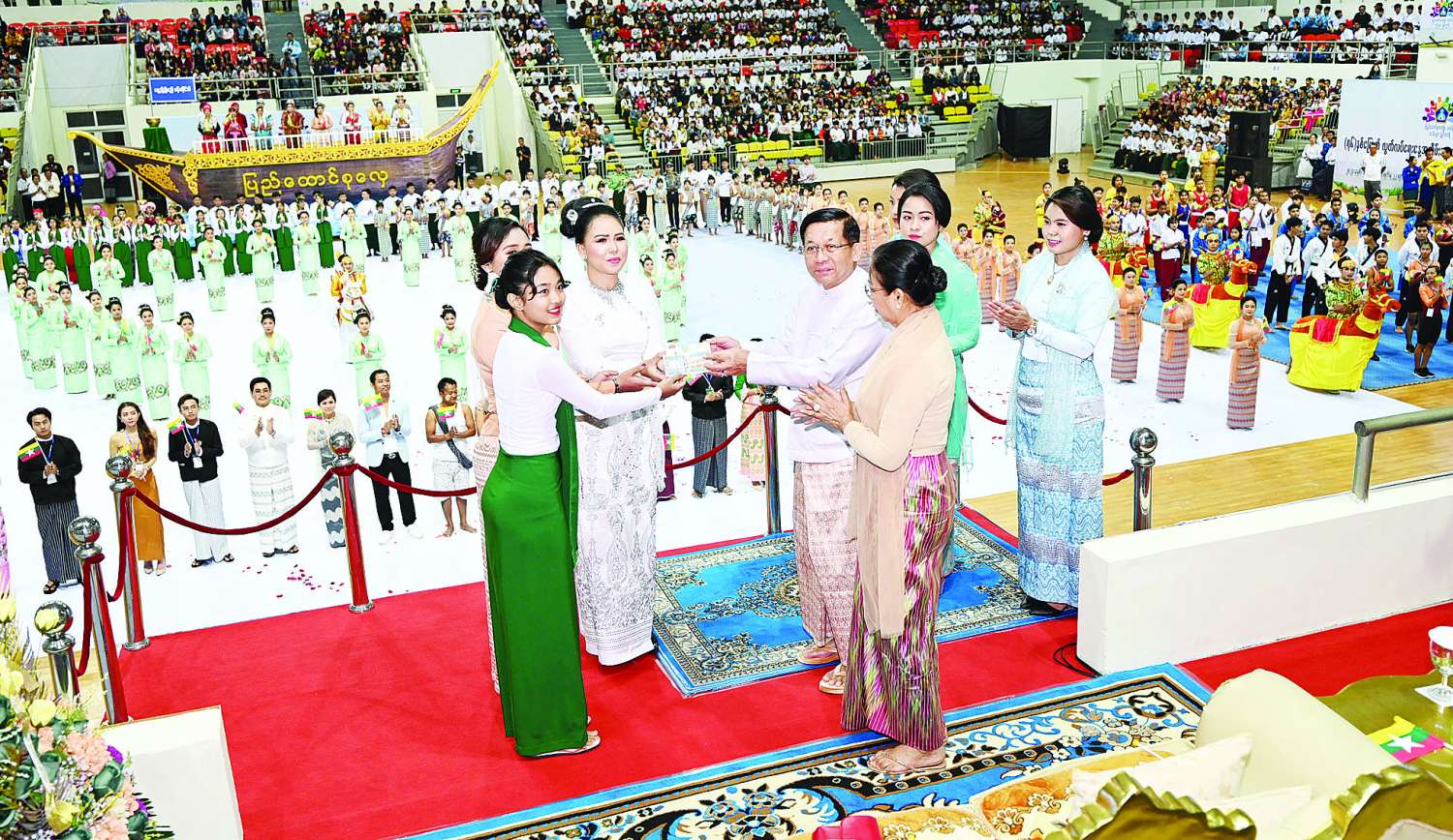 ယင်းနောက် နိုင်ငံတော်စီမံအုပ်ချုပ်ရေးကောင်စီဥက္ကဋ္ဌ နိုင်ငံတော်ဝန်ကြီးချုပ်နှင့် ဇနီးတို့က ကပြဖျော်ဖြေခဲ့ကြသည့် ကျောင်းသား ကျောင်းသူများနှင့် အနုပညာရှင်များကို ဂုဏ်ပြုပန်းခြင်းနှင့် ချီးမြှင့်ငွေများ ပေးအပ်ချီးမြှင့်ပြီး ရင်းရင်းနှီးနှီးနှုတ်ဆက်သည်။